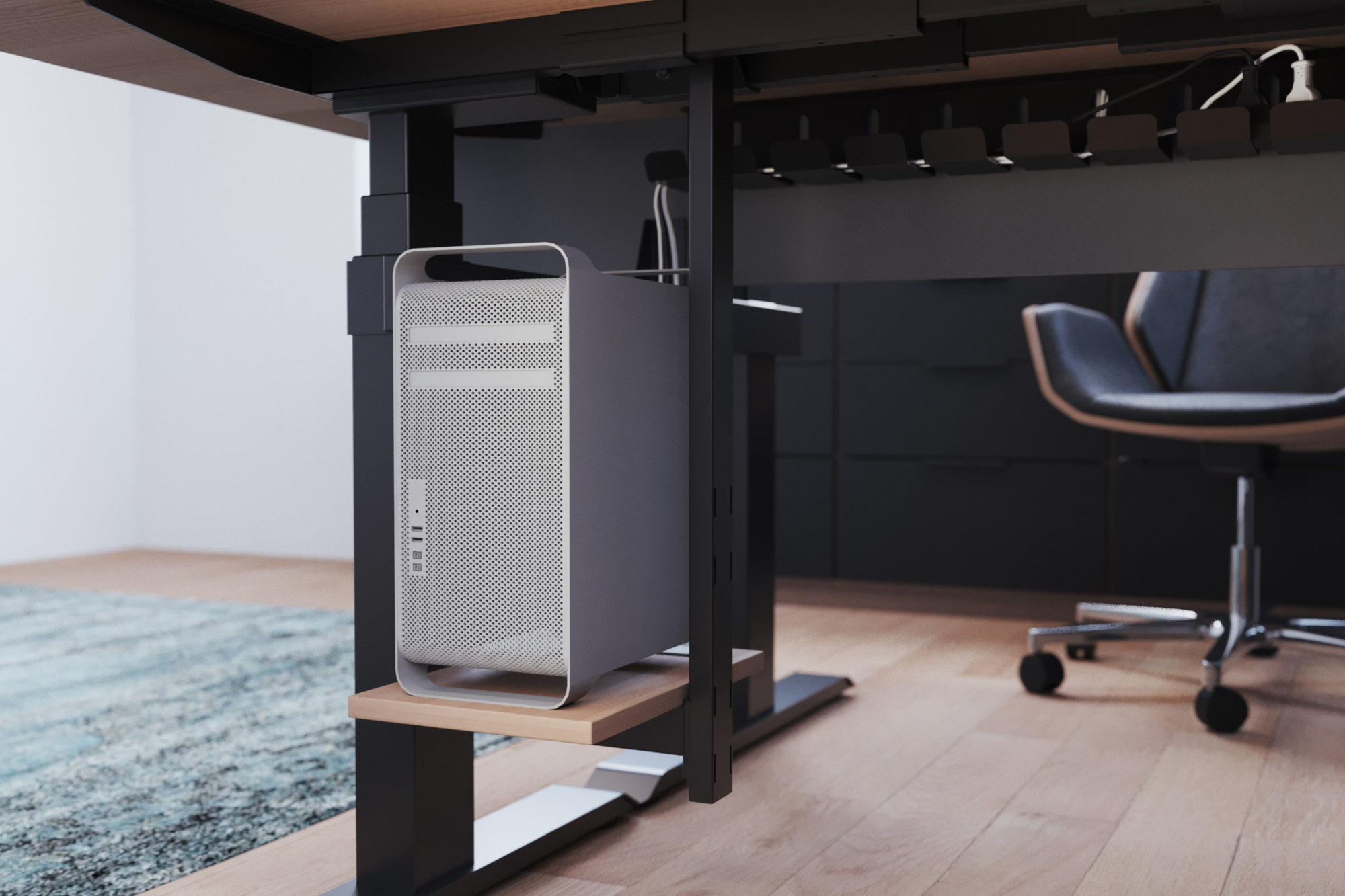 Uporządkowanie kabli – a tych przy komputerach i laptopach nigdy nie brakuje – ułatwia specjalne korytko, które można zamocować pod blatem. Zmieszczą się w nim przewody, a także listwa, przedłużacz i ładowarki. Z kolei stelaż pod jednostkę główną komputera stacjonarnego pozwala podwiesić ją w dogodnym miejscu pod blatem na wybranej przez nas wysokości. Dzięki tym rozwiązaniom, utrzymanie czystości jest dużo łatwiejsze – wystarczy przetrzeć podłogę, a sam kurz mniej osadza się na sprzęcie. Poza tym osoba pracująca ma więcej miejsca na nogi.
