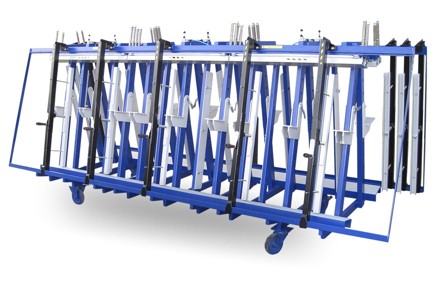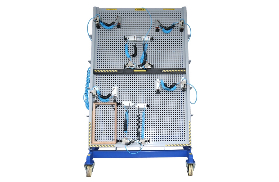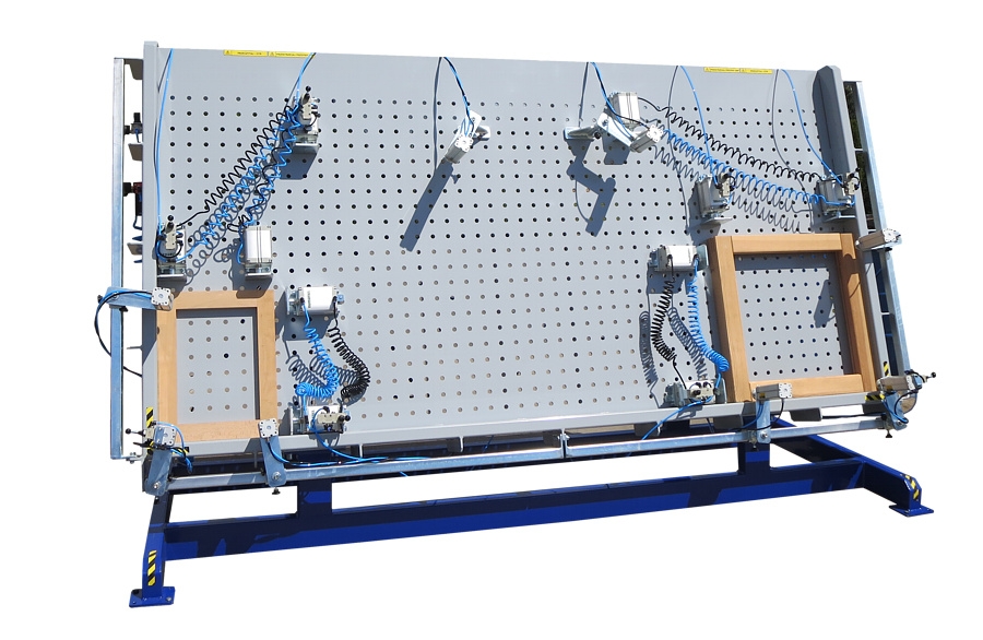 Z kolei do klejenia i montażu korpusów meblowych (szafki, szafy, kredensy, regały, komody, półki itp.) przeznaczona jest prasa montażowa PMKM z jednym lub dwoma polami załadowczymi. Urządzenie wyposażone jest w jedną/ dwie belki dociskowe, które działają w układzie pionowym oraz w jedną belkę działającą w układzie poziomym, przestawianą bezstopniowo góra-dół za pomocą motoreduktora. Każda belka wyposażona jest w siłowniki pneumatyczne tłokowe sterowane zaworem z dźwignią ręczną. Siła docisku głównego regulowana jest reduktorem ciśnienia, a siłowników tłokowych – filtroreduktorem powietrza.