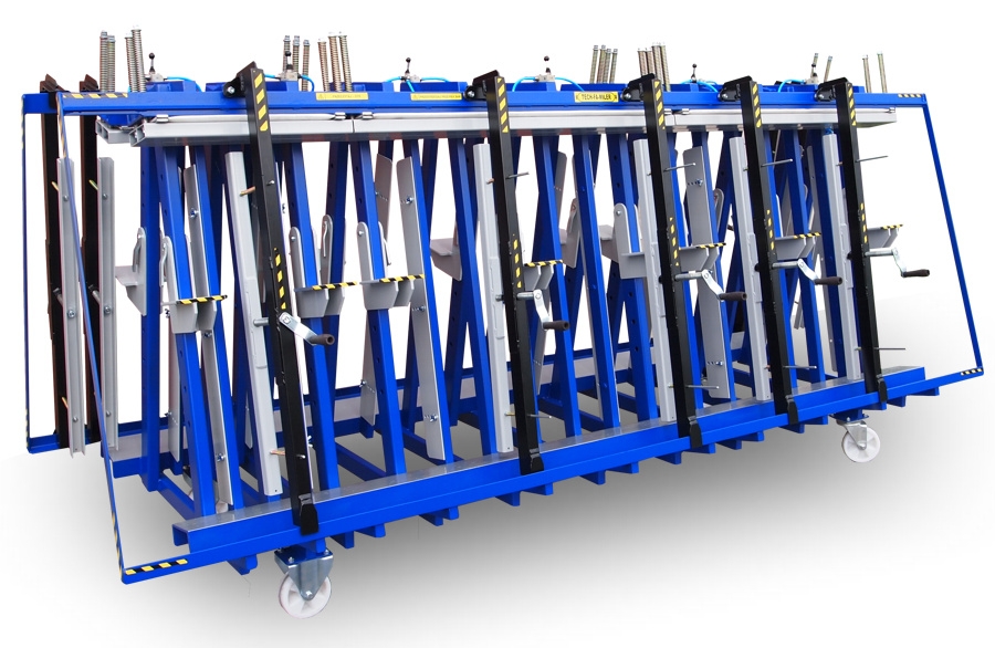 Pneumatyczna prasa trapezowa z dociskiem bocznym typ PTJDB to model, który znajduje zastosowanie w zakładach klejenia i montażu drzwi i okien, belek, parapetów, stopni schodowych, płyt meblowych itp. Wymiary klejonych elementów wynoszą: długość – do 8000 mm, szerokość – do 1300 mm, grubość – 10-220 mm. Prasa ma jedno lub dwa pola załadowcze, które są podzielone na sekcje dociskowe sterowane indywidualnie zaworem z dźwignią ręczną, przy czym każda z nich wyposażona jest w dociski śrubowe/ pneumatyczne wyrównujące klejoną płaszczyznę (jeden lub dwa dociski na jedną sekcję dociskową). Te modele pras posiadają docisk boczny wyposażony w siłowniki tłokowe sterowane zaworem z dźwignią ręczną, natomiast druga strona prasy wyposażona jest w belkę oporową przestawną. Siła docisku głównego regulowana jest reduktorem ciśnienia, a siła docisku siłowników tłokowych regulowana jest filtroreduktorem powietrza. Prasa posiada regulację środka docisku. Dodatkowym wyposażeniem urządzenia jest regulacja szerokości załadunku co 100 mm.