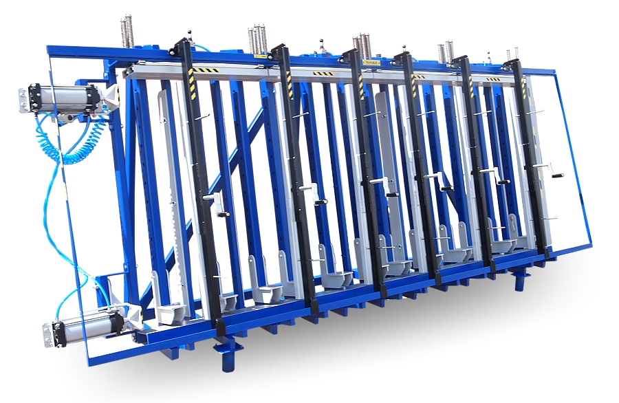 Tego typu prasy posiadają jedno lub dwa pola załadowcze, przy czym każde z nich może posiadać od jednego do czterech stanowisk roboczych wyposażonych w siłowniki pneumatyczne tłokowe sterowane zaworem z dźwignią ręczną. Prasy wyposażone są w dociski wyrównujące pneumatyczne (od czoła), imaki (dociski wyrównujące śrubowe), belki oporowe stałe i przestawne. Grubość załadunku jest regulowana, użytkownik może też ustawiać za pomocą filtroreduktora ciśnienia regulację grubości załadunku. Oferowane są na stojaku stałym lub regulowanym do pozycji poziomej.