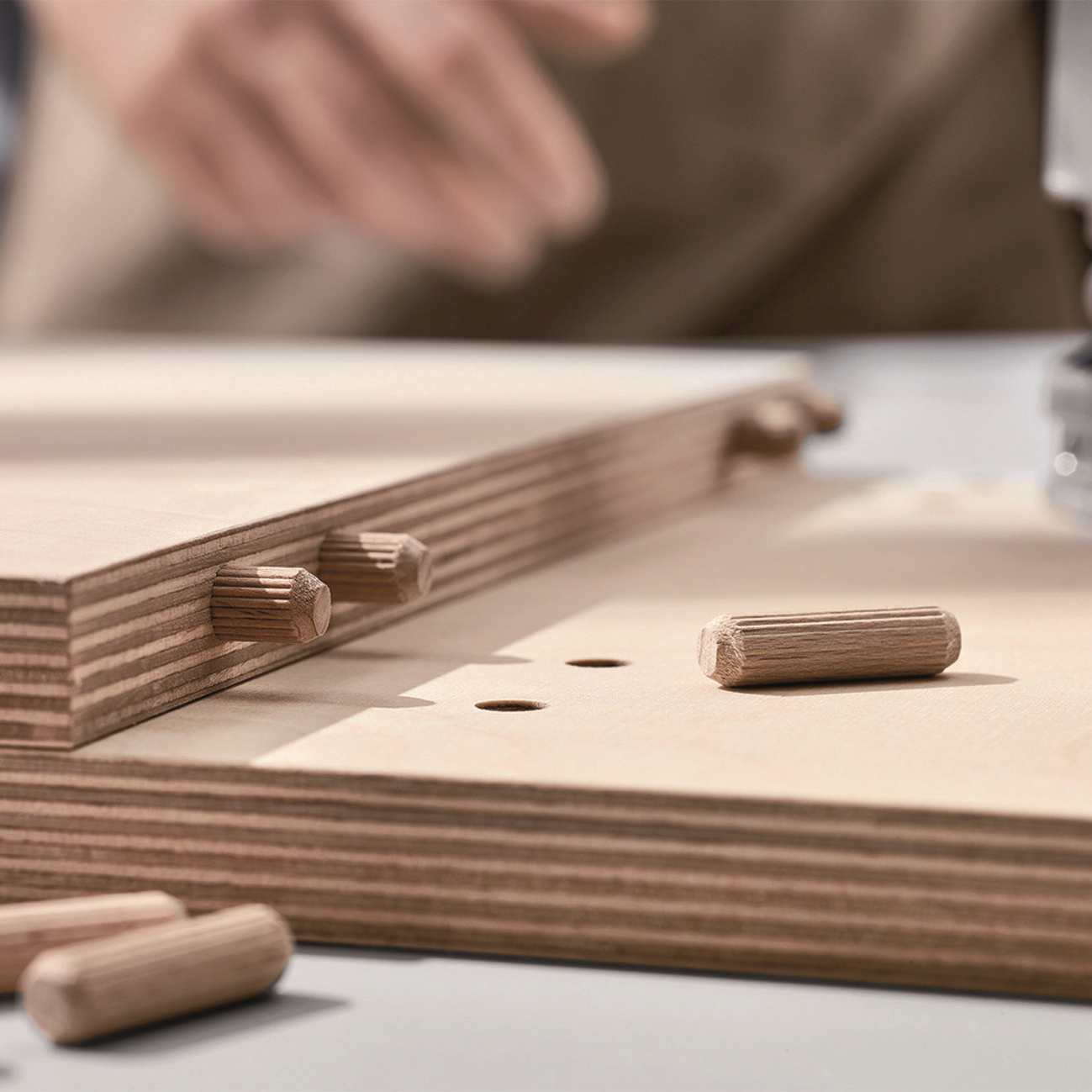 Sprawdzona technika podwójnego kołkowania zapobiega skręcaniu się elementów po montażu. W rezultacie wyrównywanie przedmiotów po ich złożeniu jest niepotrzebne. Rozstaw 32 mm pomiędzy otworami to standard na co dzień stosowany przez profesjonalistów.
