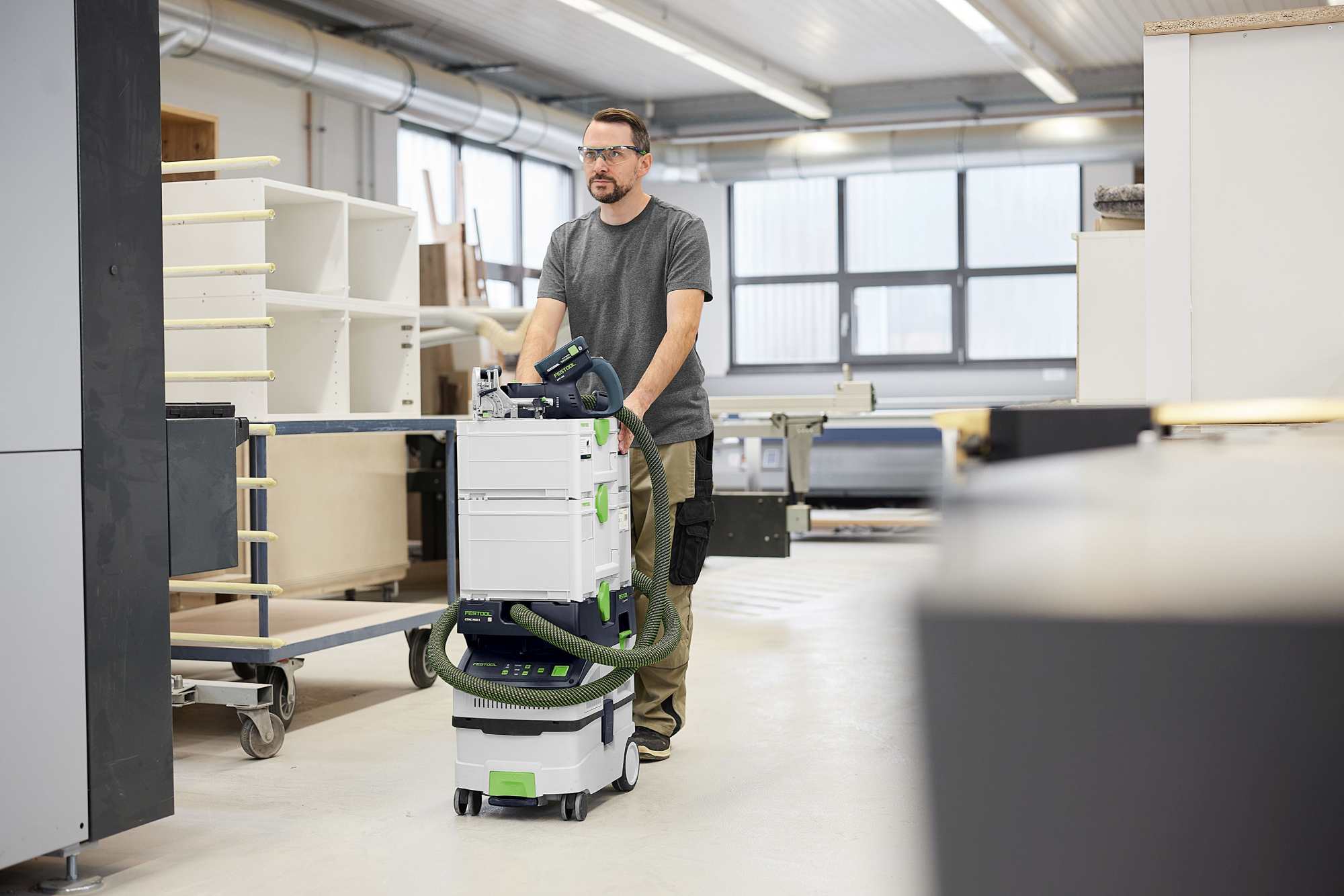 DFC 500 opiera się na udanej koncepcji poprzedniego przewodowego modelu DF 500, ale Festool konsekwentnie rozwija go do użytku mobilnego. Wyposażona w wydajny akumulator 18 V, umożliwia niezależną pracę – idealną na placach budowy lub w warsztatach z elastycznymi miejscami pracy. W połączeniu z odkurzaczem akumulatorowym możliwa jest nawet całkowicie bezprzewodowa praca.