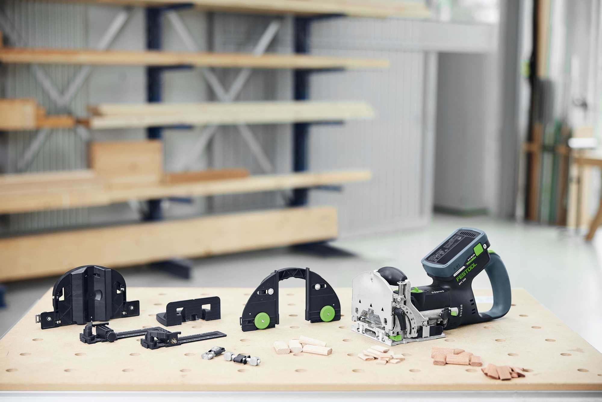 System DOMINO oferuje łączniki w różnych rozmiarach (od 4 x 20 mm do 10 x 50 mm) i dwóch rodzajach drewna do zastosowań wewnętrznych i zewnętrznych. Uzupełnieniem jest bogaty asortyment akcesoriów. Znajdziemy tu między innymi prowadnice do elementów okrągłych i profilowanych. Są także prowadnice do listew i frezowania rzędu kołków – idealne do mebli, szafek, wnętrz i stoisk wystawienniczych. DFC 500 jest częścią systemu Festool 18 V i imponuje wagą wynoszącą zaledwie 3,4 kg.