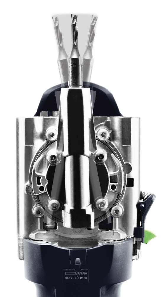 Praca – nawet przy dłuższych zastosowaniach. Cztery zintegrowane sworznie ustalające zapewniają szybkie i precyzyjne pozycjonowanie frezu do łączników bez konieczności czasochłonnego znakowania. Umożliwia to również wydajne i powtarzalne ustawianie kilku łączników obok siebie.