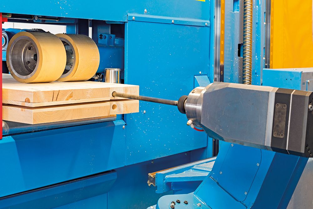 Możliwość indywidualnego dopasowania maszyny do potrzeb dotyczy też 5-osiowej uniwersalnej frezarki. Standardowo dostarczana jest ona z agregatem 11 kW, jednak można ją wyposażyć również w nowy, wysoko wydajny agregat 35 kW i w ten sposób ponad trzykrotnie zwiększyć jej moc. Zamiast agregatu 5-osiowego w K2-Industry dostępny jest również dodatkowy agregat 4-osiowy. Wszystkie osie wyposażone są w serwonapędy, co oprócz najwyższej prędkości i dokładności zapewnia również możliwość jednoczesnej zmiany położenia. Zarówno powierzchnie przylegania drewna, jak i wykorzystanie miejsca są ponownie optymalizowane ze zmienioną geometrią. Bezpośredni napęd bez przekładni pośredniej i bezstopniowa regulacja prędkości obrotowej w zakresie 0 – 5200 obr./min umożliwia jednoczesny montaż 3 narzędzi i wysoce wydajne frezowanie czopów i gniazd czopowych, zblatowań, profili, zaciosów, połączeń „na jaskółczy ogon” itd.