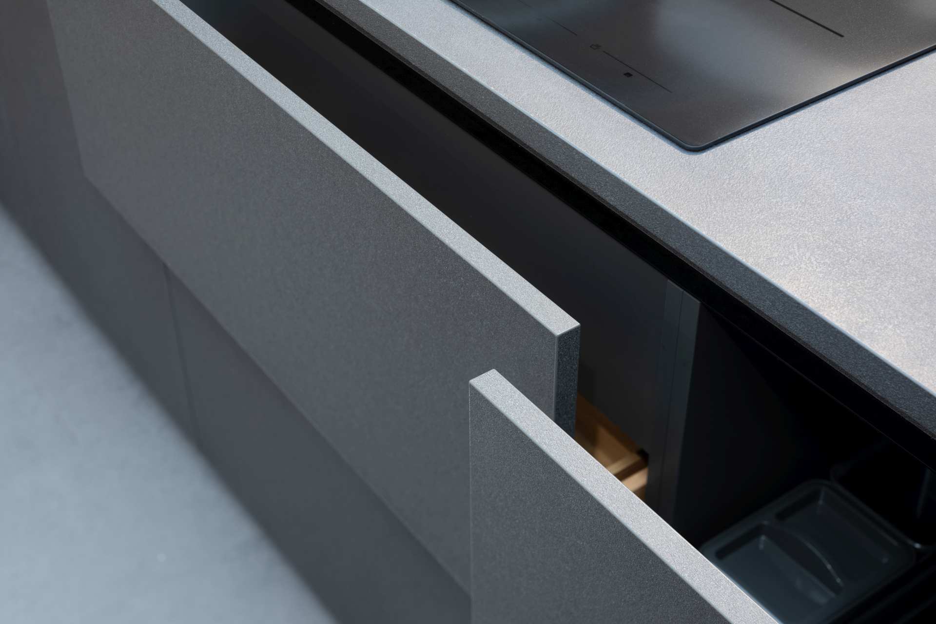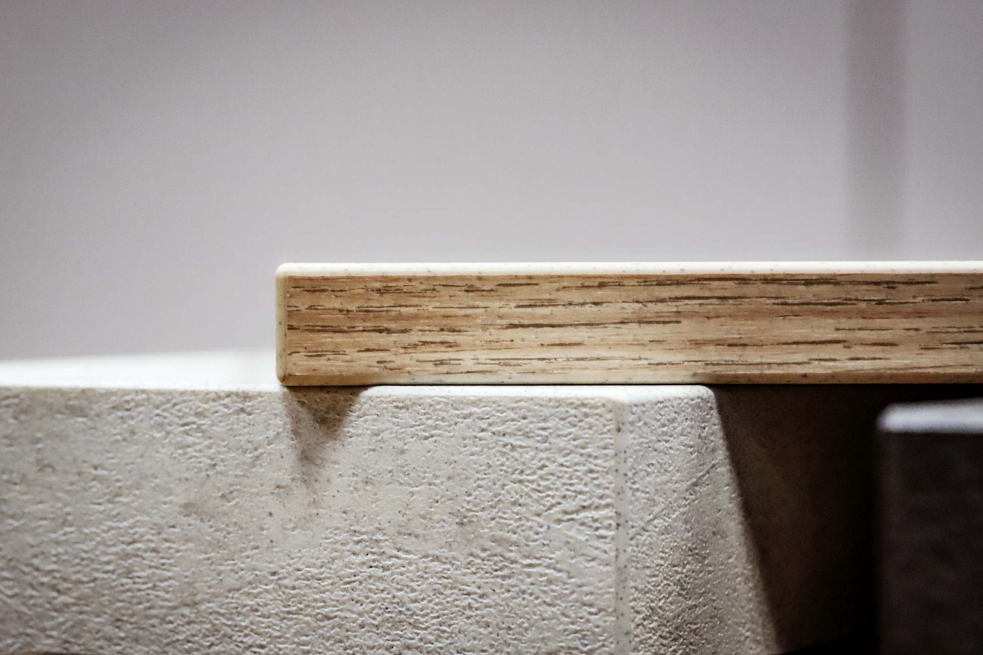 Materiał, z którego firma REHAU produkuje te obrzeża zawiera zatopione ziarna pigmentu. Są one widoczne również po fazowaniu krawędzi, co nadaje projektom realistycznego wyglądu. RAUKANTEX pigmento najlepiej sprawdza się w zestawieniu z płytami imitującymi beton, ceramikę lub powierzchnie kamienne.