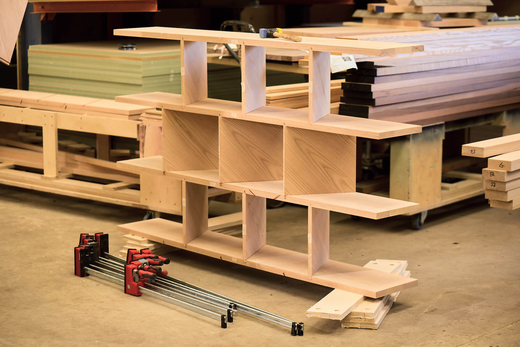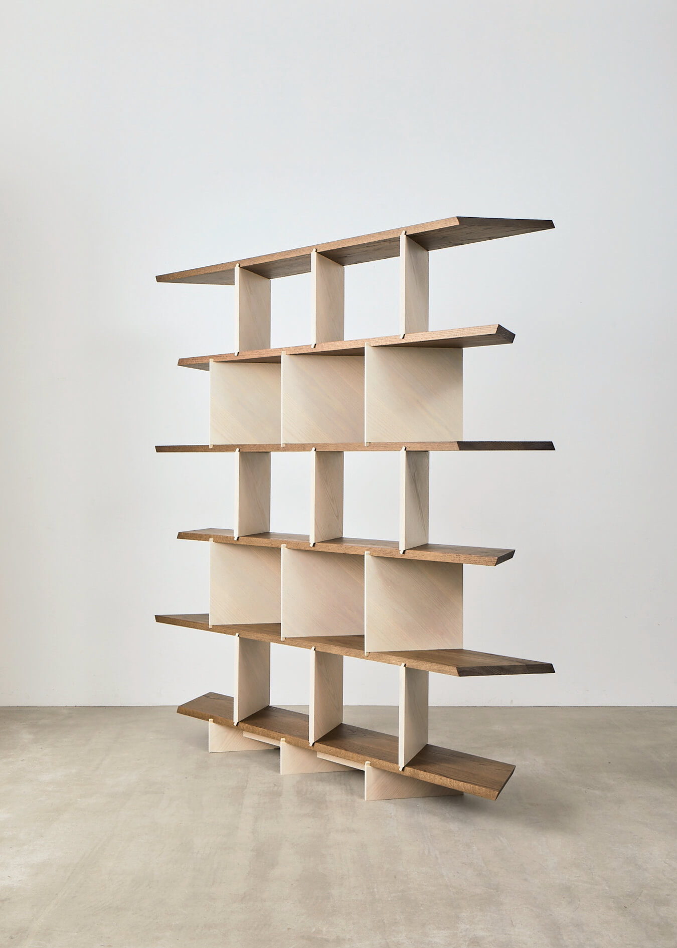 M. G.: Widziałem wcześniej meble z użyciem czerwonego dębu amerykańskiego, ale głównie był to fornir, a nie lite drewno. Jest to dość szybko rosnący gatunek, stąd jego wyraziste usłojenie. Aby podkreślić i ukazać rys słojów, postanowiłem zróżnicować elementy pionowe i poziome regału oraz zastosować różne wykończenia. Części poziome zostały wybarwione amoniakiem i wyglądają jak ciemny kasztan lub orzech, podczas gdy części pionowe zostały lekko wybielone. Analogicznie, elementy poziome wykonałem z litego drewna, gdyż są one elementami konstrukcyjnymi, z kolei pionowe są fornirowane, by nieco ożywić mebel. Regał sam w sobie nie jest projektem statycznym ze względu na przechylenie w jedną stronę, ale chciałem nadać mu jeszcze większego dynamizmu, wykorzystując w tym celu usłojenie – słoje skierowane są w jednym kierunku, a regał w przeciwnym.