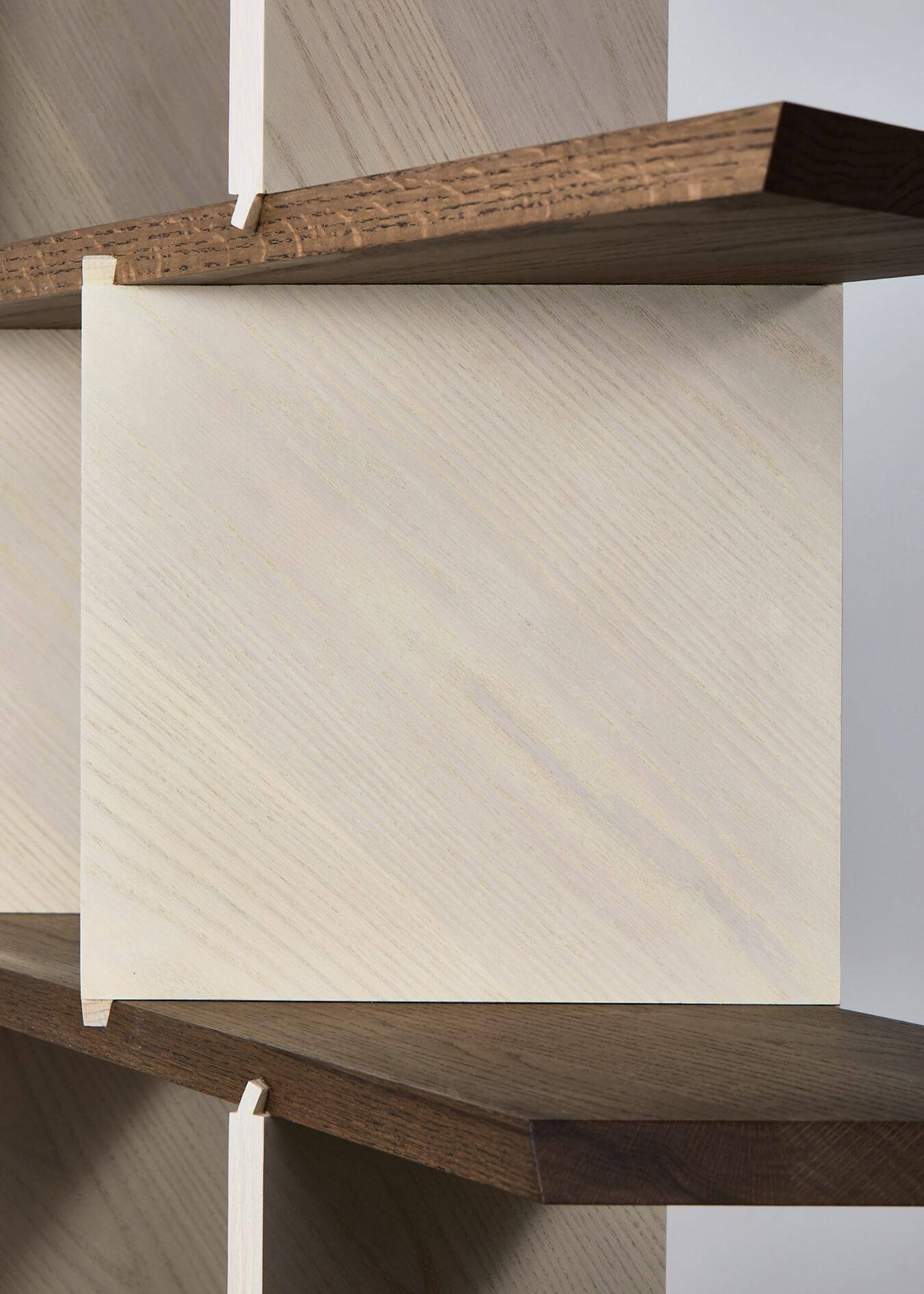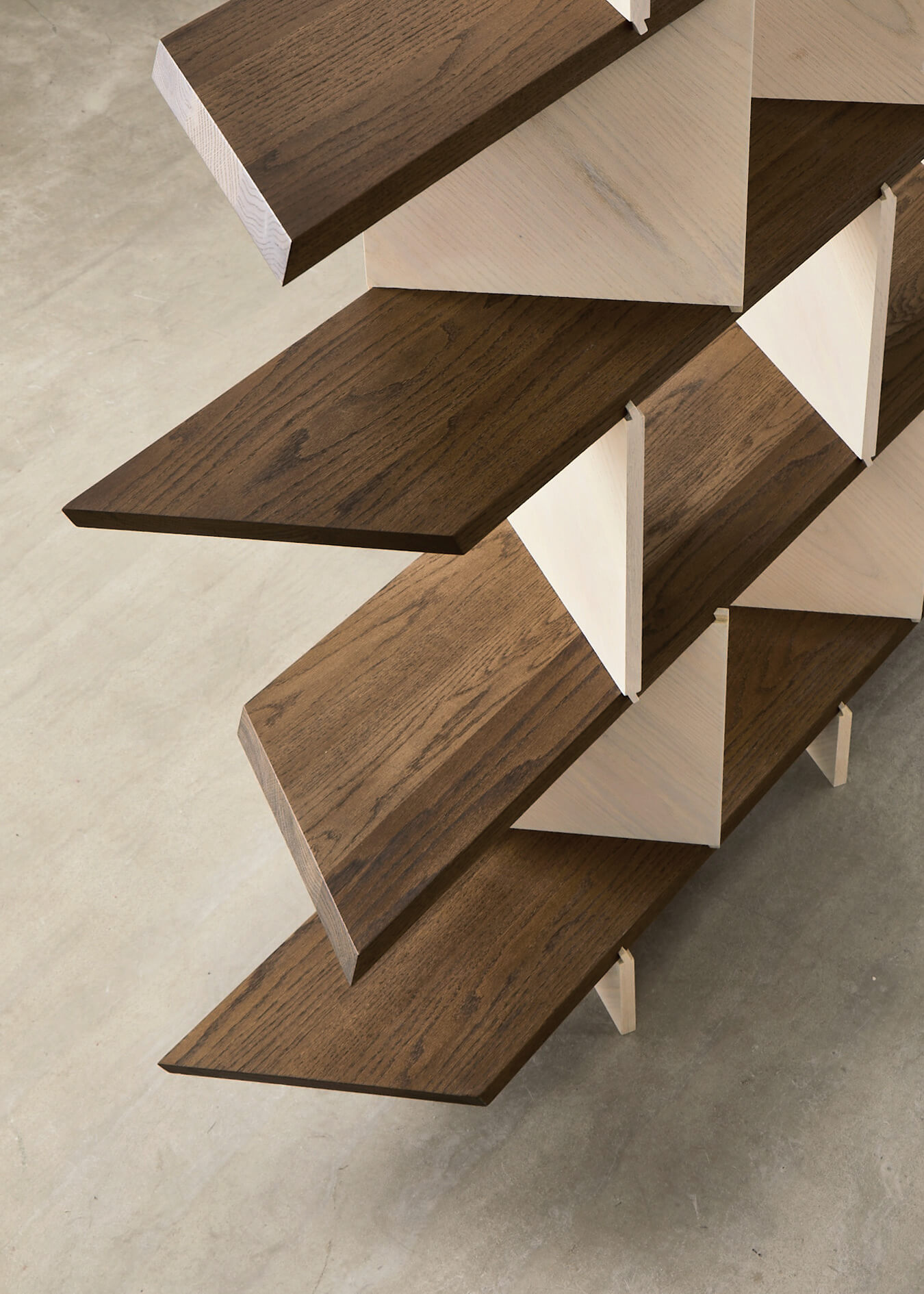 M. G.: Jednym z celów projektu było stworzenie przedmiotu modułowego. Zdecydowałem się zrezygnować z klejenia, więc cała konstrukcja połączona została na jaskółczy ogon, który mocuje się od góry, a nie z boku. To łączenie zapewnia podobną wytrzymałość, ale jest łatwiejsze w produkcji i użytkowaniu oraz stwarza nieograniczone możliwości w tworzeniu regałów modułowych. Tego rodzaju drobne szczegóły są dla mnie bardzo ciekawe. Kształt samego mebla przypomina nieco w swoim charakterze rzeźbę, co jest kolejnym, równie interesującym dla mnie aspektem, ponieważ chodzi o zakwestionowanie koncepcji, że mebel powinien być prostokątny lub dwuwymiarowy.