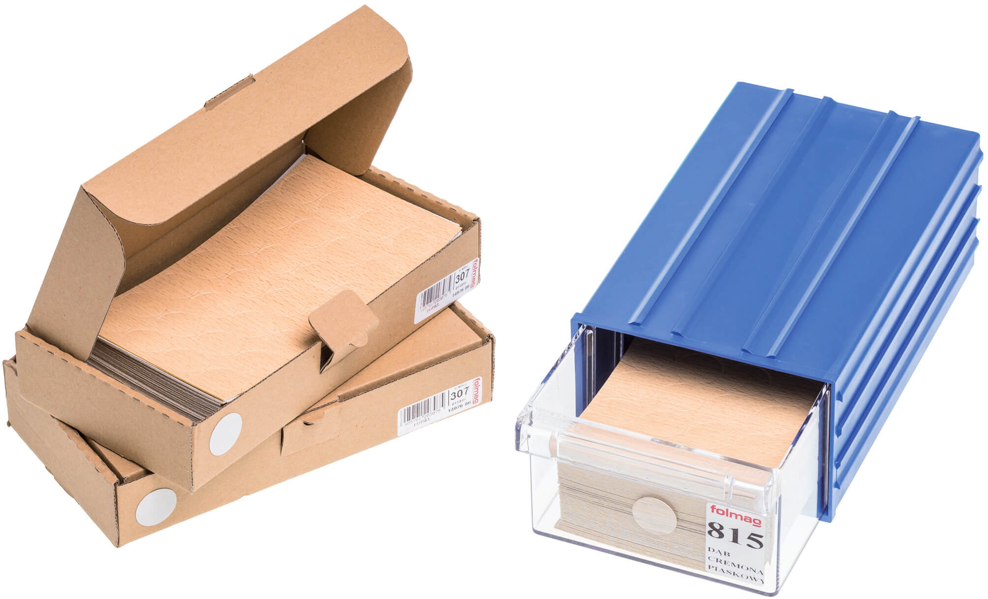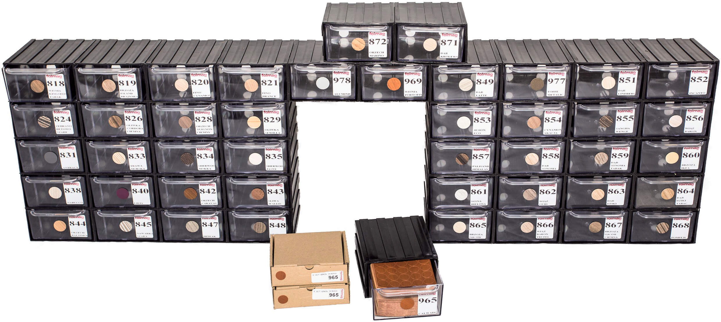 Wytwarzane przez Folmag zaślepki są oferowane w dwóch standardowych wymiarach: 14 i 20 mm, ale na życzenie mogą mieć inny, pożądany przez klienta rozmiar (a także kształt), obecnie coraz większą popularnością cieszy się na przykład wymiar 40 mm. Wyroby te dostarczane są w opakowaniach zbiorczych, zawierających 50 arkuszy danego dekoru, jeden arkusz liczy 25 lub 28 zaślepek, w zależności od wielkości produktu. Wybór wzorów jest dopasowany przede wszystkim do produktów czterech głównych producentów płyt: Kronopolu, Kronospanu, Pfleiderera oraz Eggera. Obecnie dostępnych jest 177 kolorów, ale oferta jest cały czas wzbogacana o nowe propozycje.