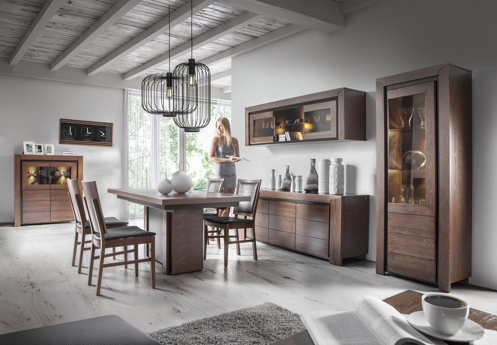 Wytrawne oko konesera dostrzeże w uchwyceniu formy, proporcjach, połączeniach materiałowych i funkcjonalnych rozwiązaniach fascynację najlepszymi wzorcami historycznego modernizmu, jednak całość jest jak najbardziej świeża, oryginalna i mocno osadzona w stylistyce XXI wieku. W programie do salonu, pokoju dziennego i jadalni znajduje się szeroki wybór witryn stojących i wiszących, barków, szafek, komód, regałów i mebli TV. Kolekcję uzupełniają krzesła i stoły: klasyczny rozsuwany, na nodze kolumnowej oraz praktyczny ławostół z funkcją podnoszenia i rozsuwania blatu. Na uwagę zasługują udogodnienia, które zastosowano w tej kolekcji, takie jak: system otwierania push to open oraz efektowne oświetlenie LED.