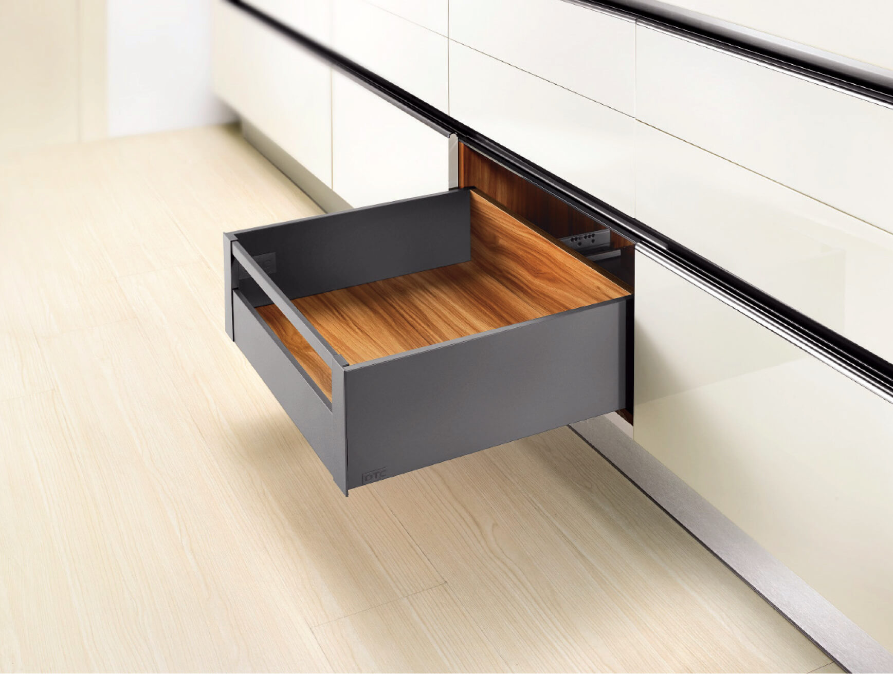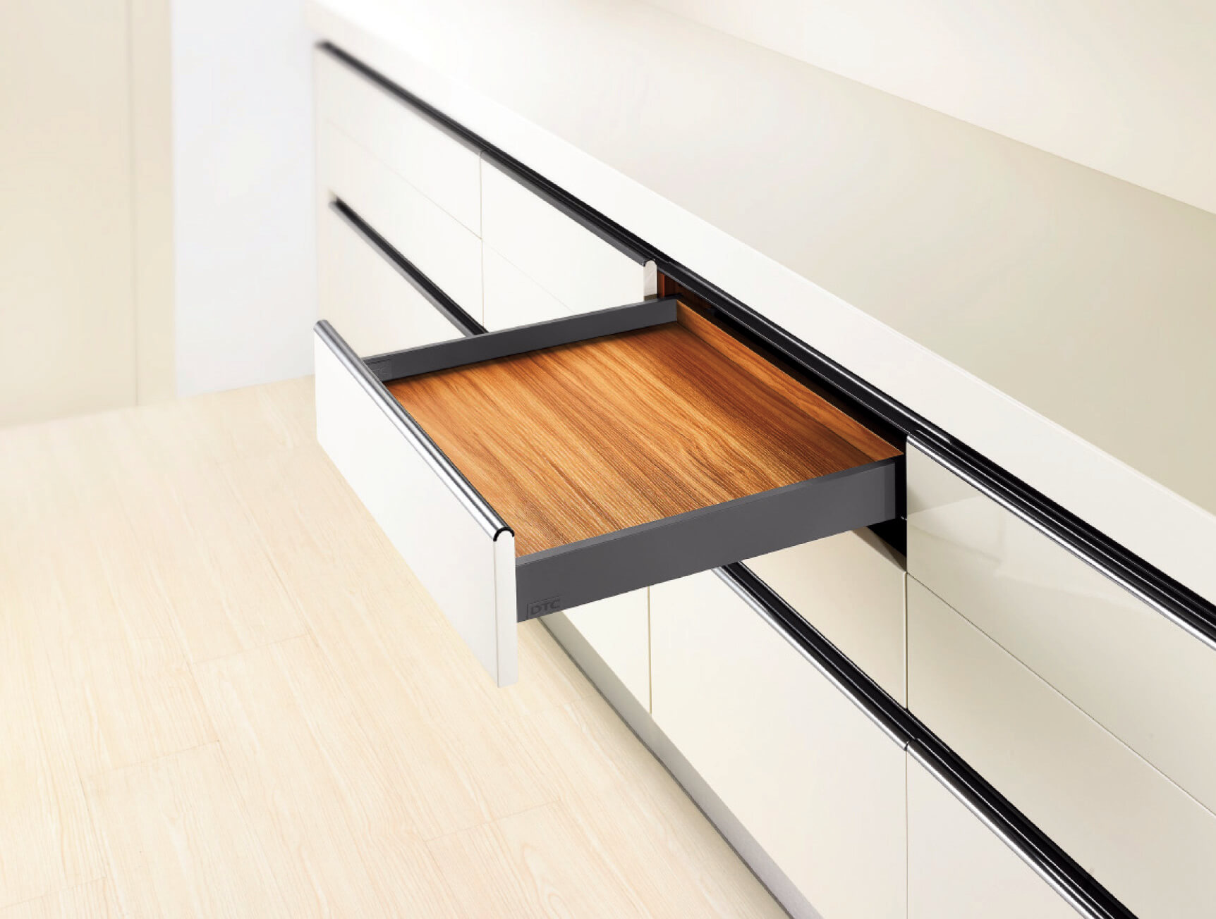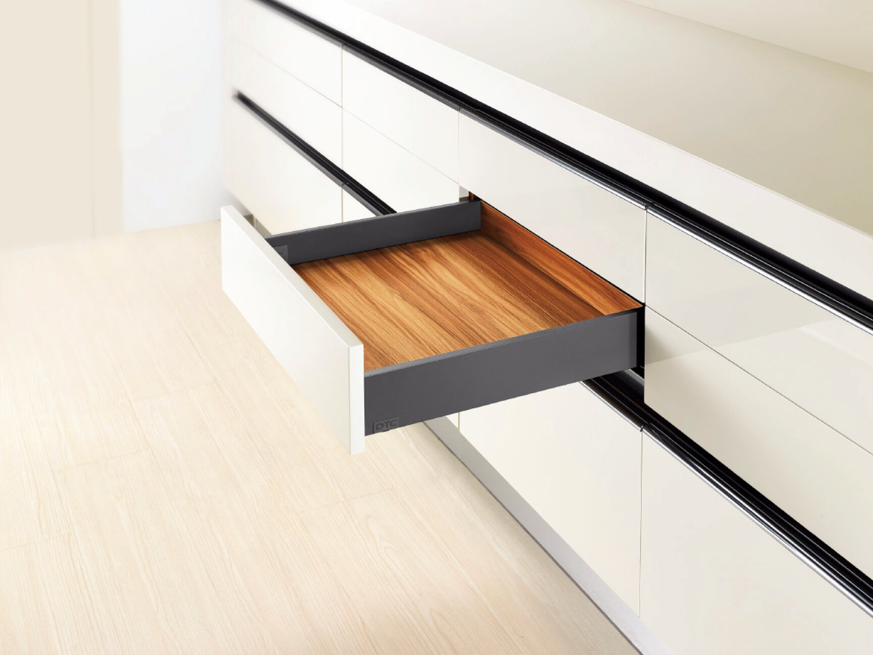 Zmniejszony rozmiar boków i wysokie obciążenie dynamiczne 40 kg pozwala na zagospodarowanie dodatkowej przestrzeni wewnątrz szuflady. Nowa konstrukcja opiera się na wysokiej klasy prowadnicach z funkcją miękkiego domykania, gwarantując bezproblemową pracę przez wiele lat.