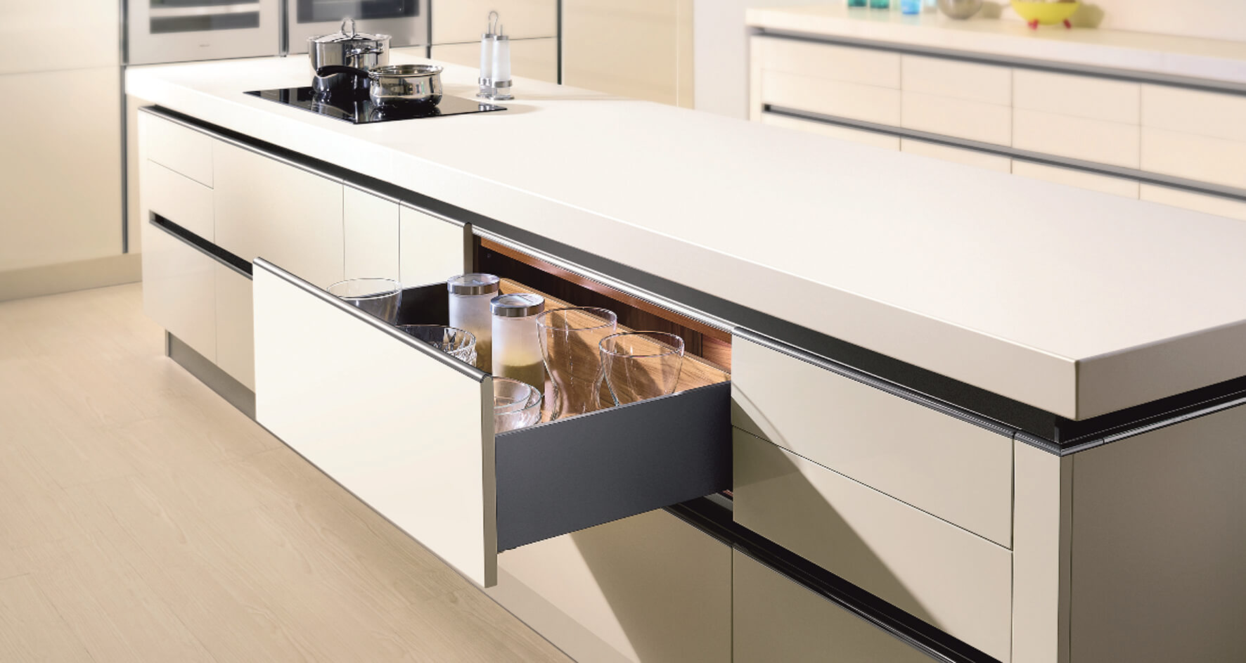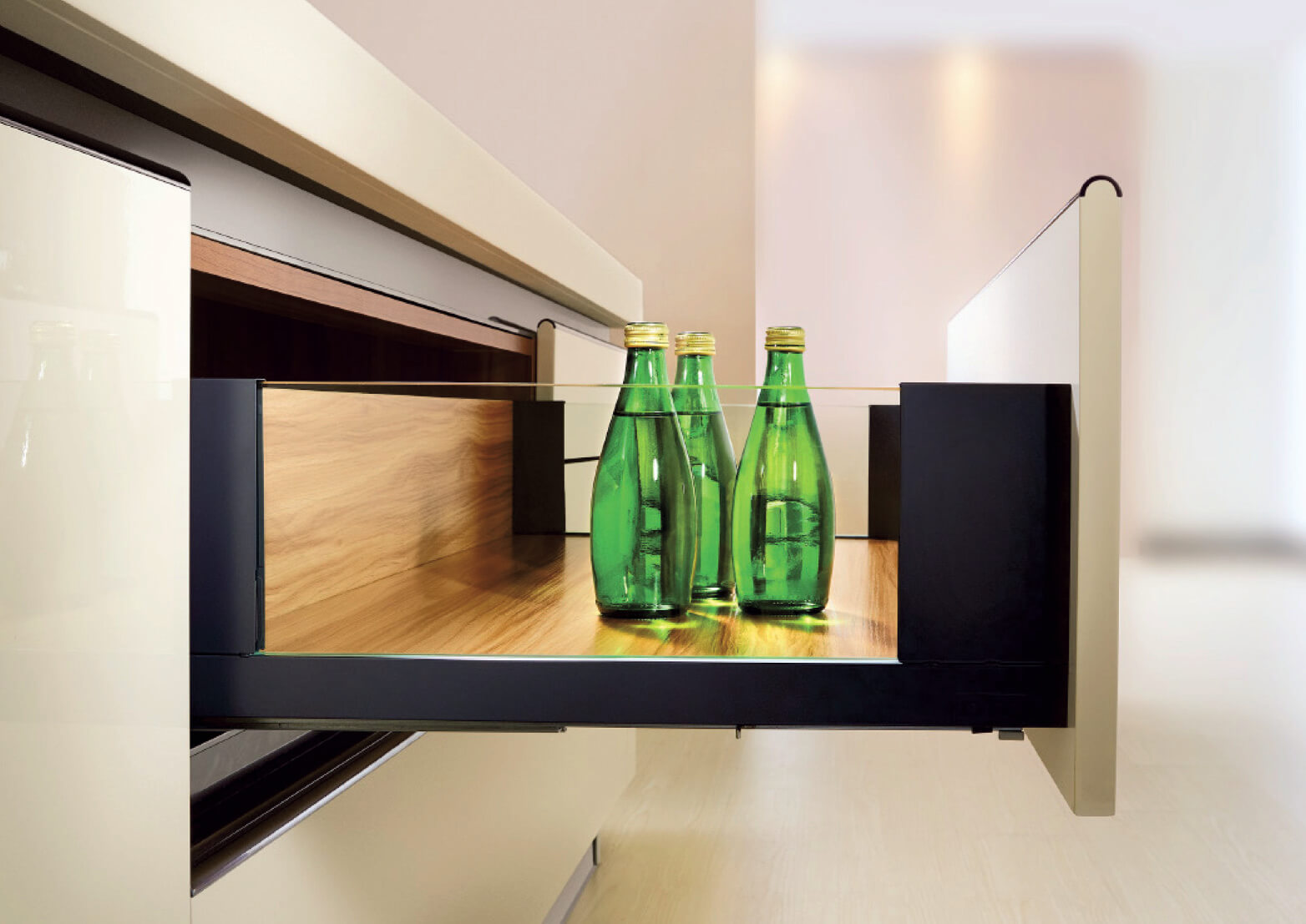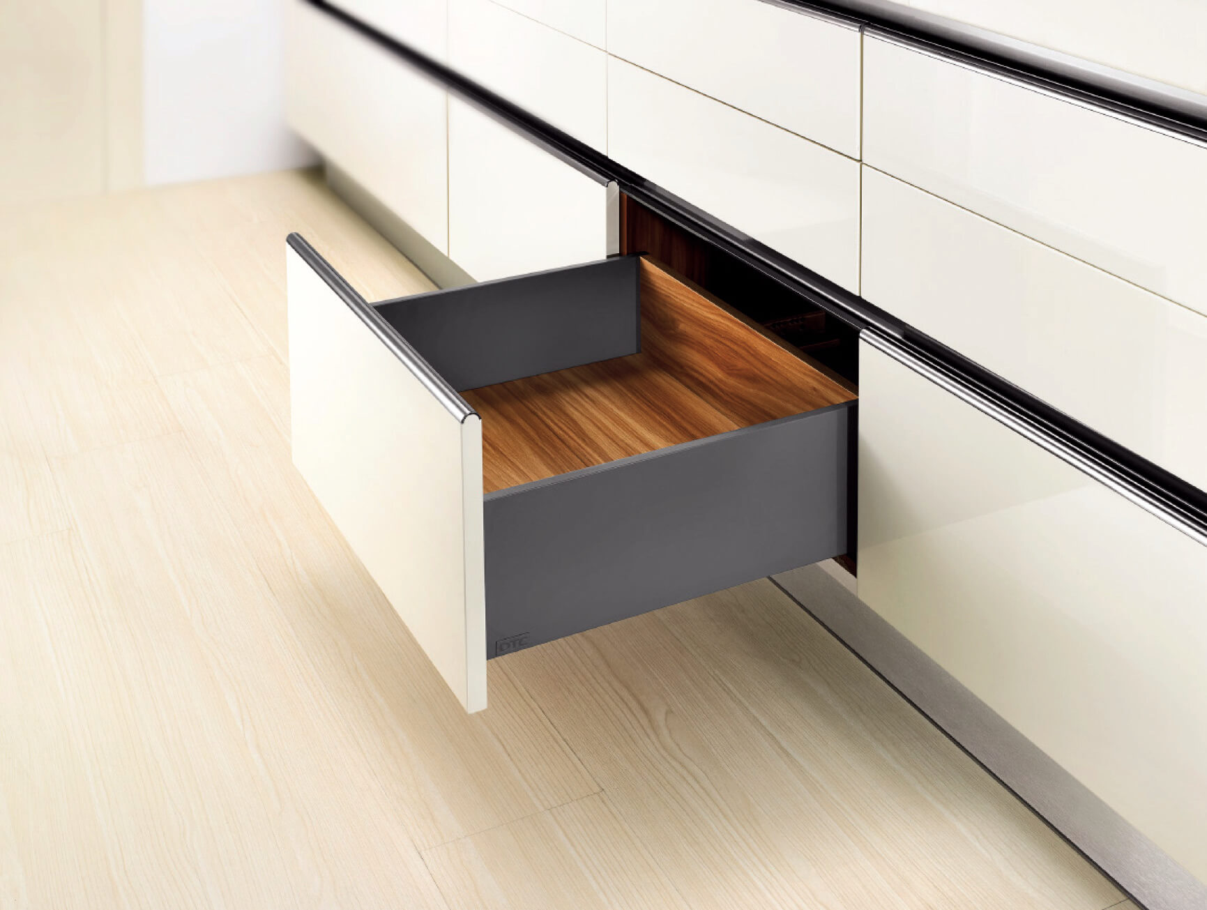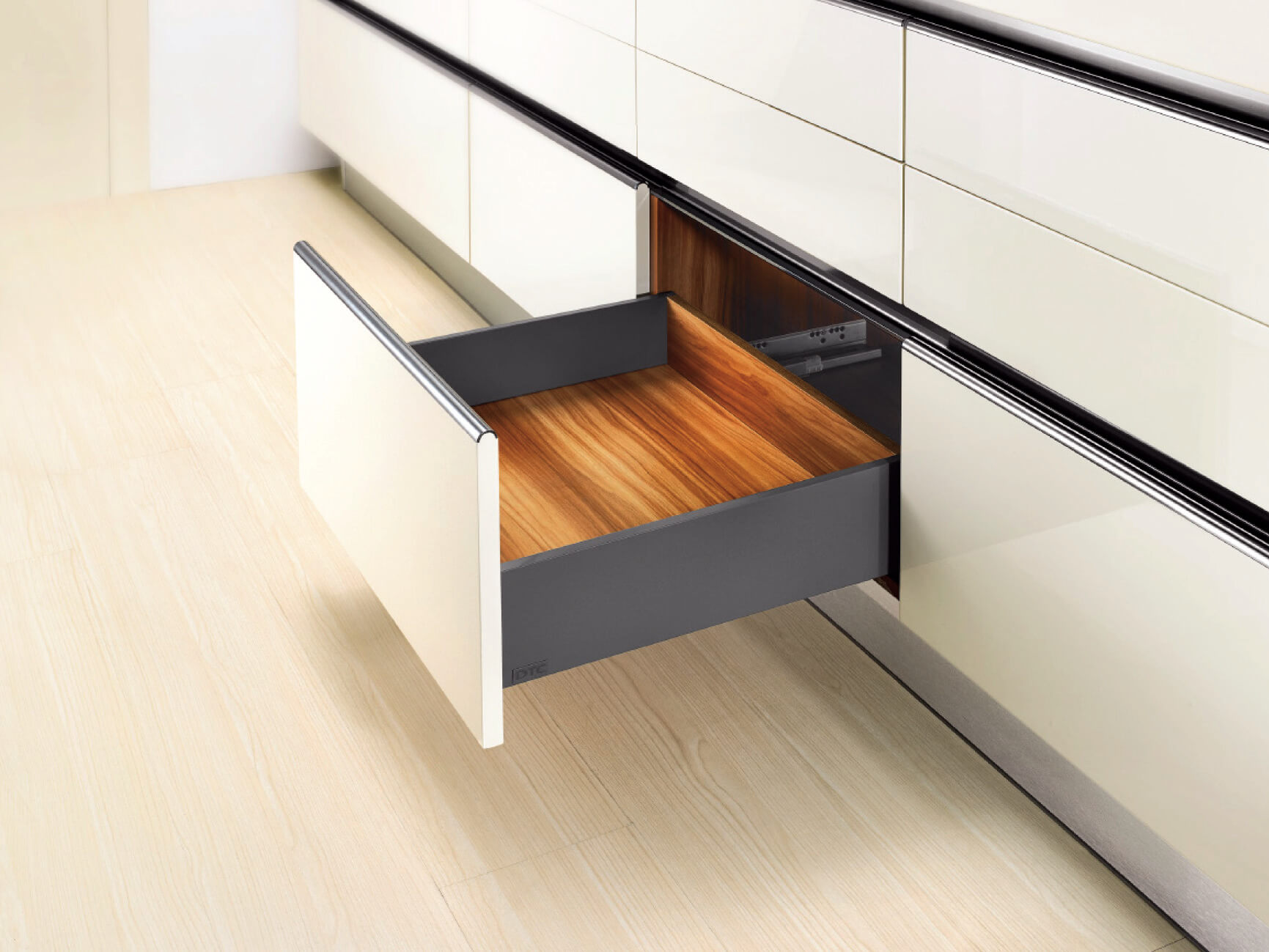 Zmniejszony rozmiar boków i wysokie obciążenie dynamiczne 40 kg pozwala na zagospodarowanie dodatkowej przestrzeni wewnątrz szuflady. Nowa konstrukcja opiera się na wysokiej klasy prowadnicach z funkcją miękkiego domykania, gwarantując bezproblemową pracę przez wiele lat.