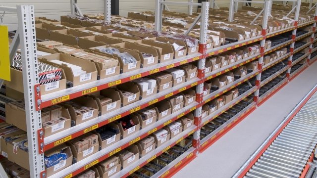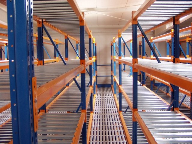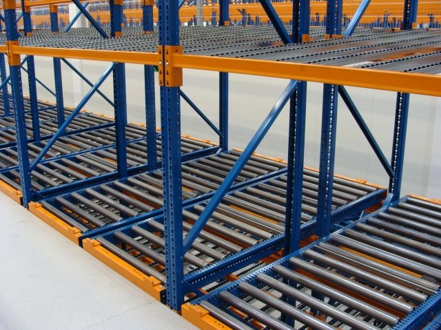 Regały przepływowe dla towarów małogabarytowych są idealnym systemem kompletowania zamówień. Towary (pojemniki, kartony, pudełka, torby) przesuwają się pod wpływem siły grawitacji po lekko nachylonym torze rolkowym. System ten może być wykorzystany w kombinacji z systemem paletowym.
