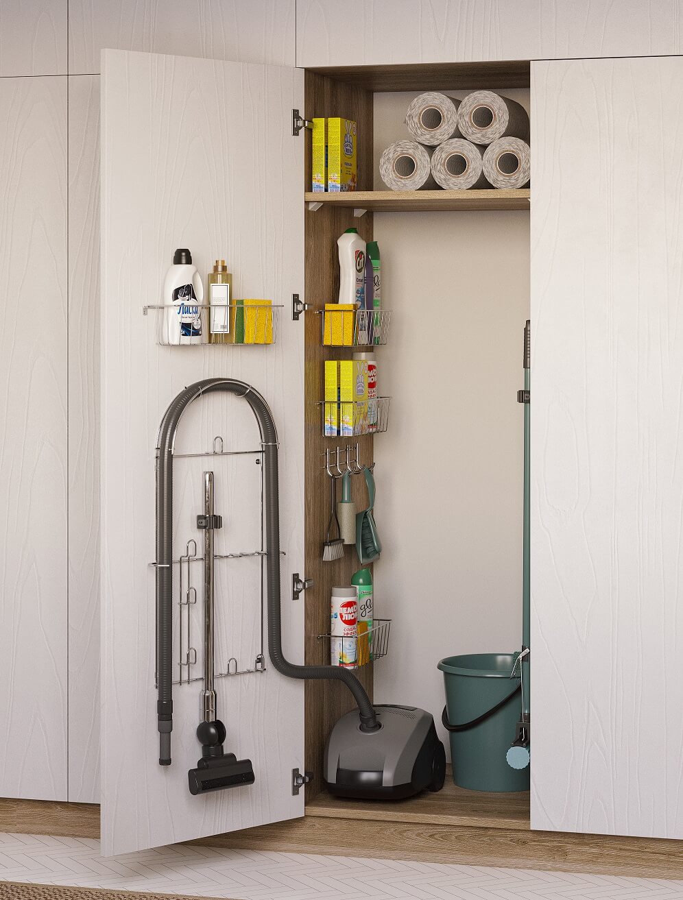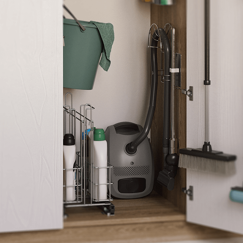 Jeśli zaś uznamy, że to za mało, zdecydować się możemy na wysuwany stelaż House Master. Na nim pomieścimy nie tylko rurę, ale i sam odkurzacz. Poza tym wejdą tam wszystkie akcesoria potrzebne do utrzymania w domu czystości. Dostępny w wersji prawej i lewej House Master przeznaczony jest do szafek o szerokości 400 mm. Można go zastosować zarówno do drzwiczek przesuwnych lub osadzonymi na standardowych zawiasach. W wersji podstawowej obejmuje 3 kosze o różnych rozmiarach, listwę na 3 haczyki, wieszak na rurę odkurzacza i 3 uchwyty na trzonki. Kosze są wyłożone matą antypoślizgową, dzięki czemu butelki nie przesuwają się podczas wysuwania stelaża.