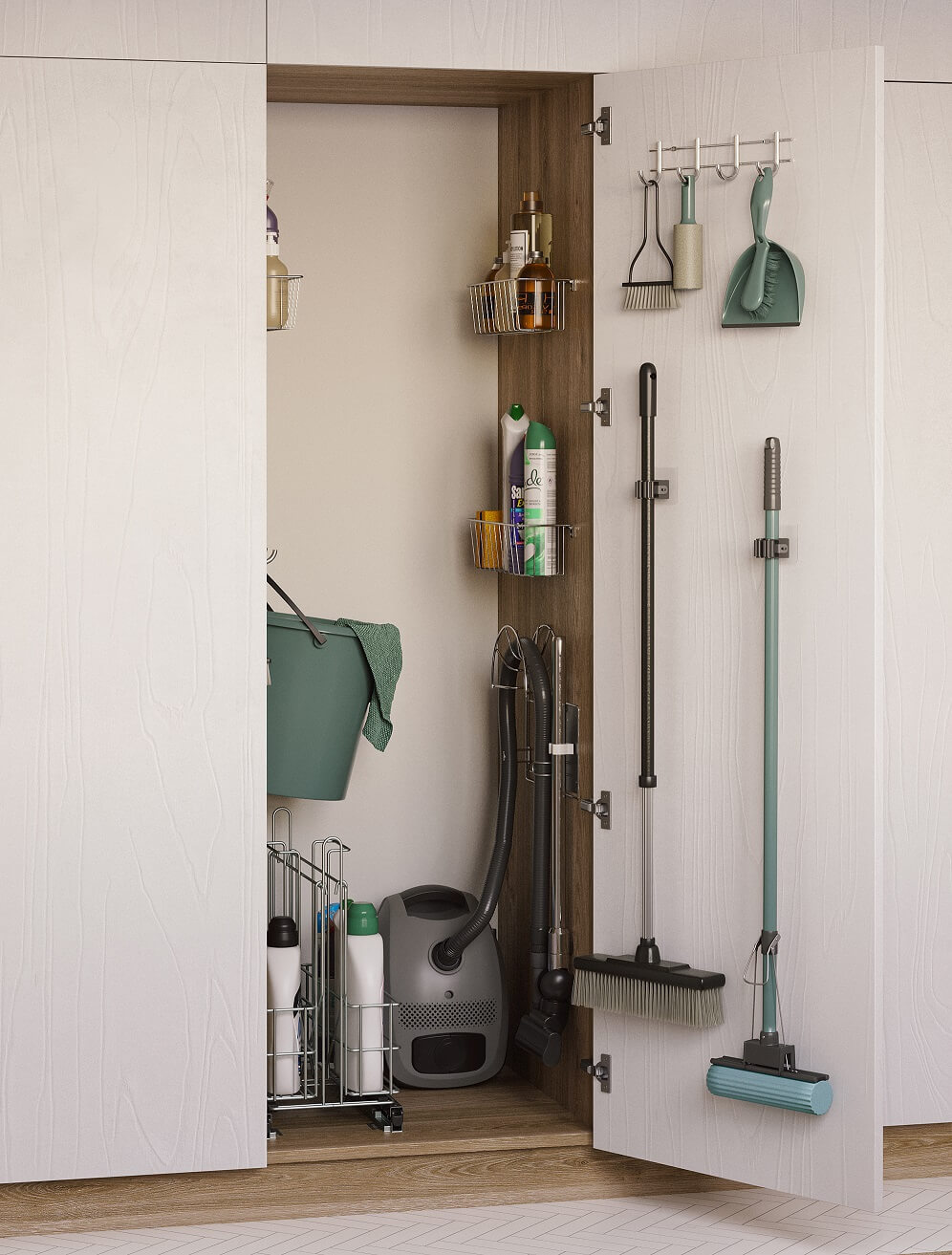 Jeśli zaś mowa o detergentach… Choć zazwyczaj przechowujemy je na tradycyjnych półkach, nie jest to najwygodniejsza opcja. Aby dostać się do butelki czy pudełka postawionego z tyłu, na ogół przesunąć trzeba kilka innych opakowań. A to zabiera czas i tworzy bałagan. Znacznie bardziej funkcjonalnym rozwiązaniem są systemy wysuwne – szuflady, cargo, wspomniany wcześniej House Master albo… zawieszone na drzwiach koszyki, w których trzymać możemy najpotrzebniejsze rzeczy. Dzięki nim preparaty, których używamy najczęściej będą zawsze pod ręką.