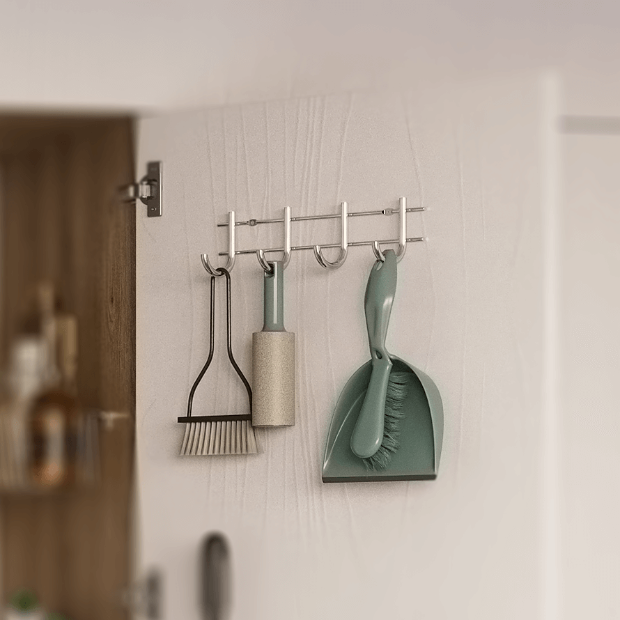 – Są to: duży wieszak z 3 ażurowymi półeczkami na detergenty i akcesoria do sprzątania, duży wieszak z haczykami i uchwytami np. na mopy i szczotki, a także najmniejszy model, który zmieścić można nawet na wąskim froncie. Oczywiście na każdym jest również odpowiednio wyprofilowane miejsce na rurę. – wyjaśnia Damian Rybak.