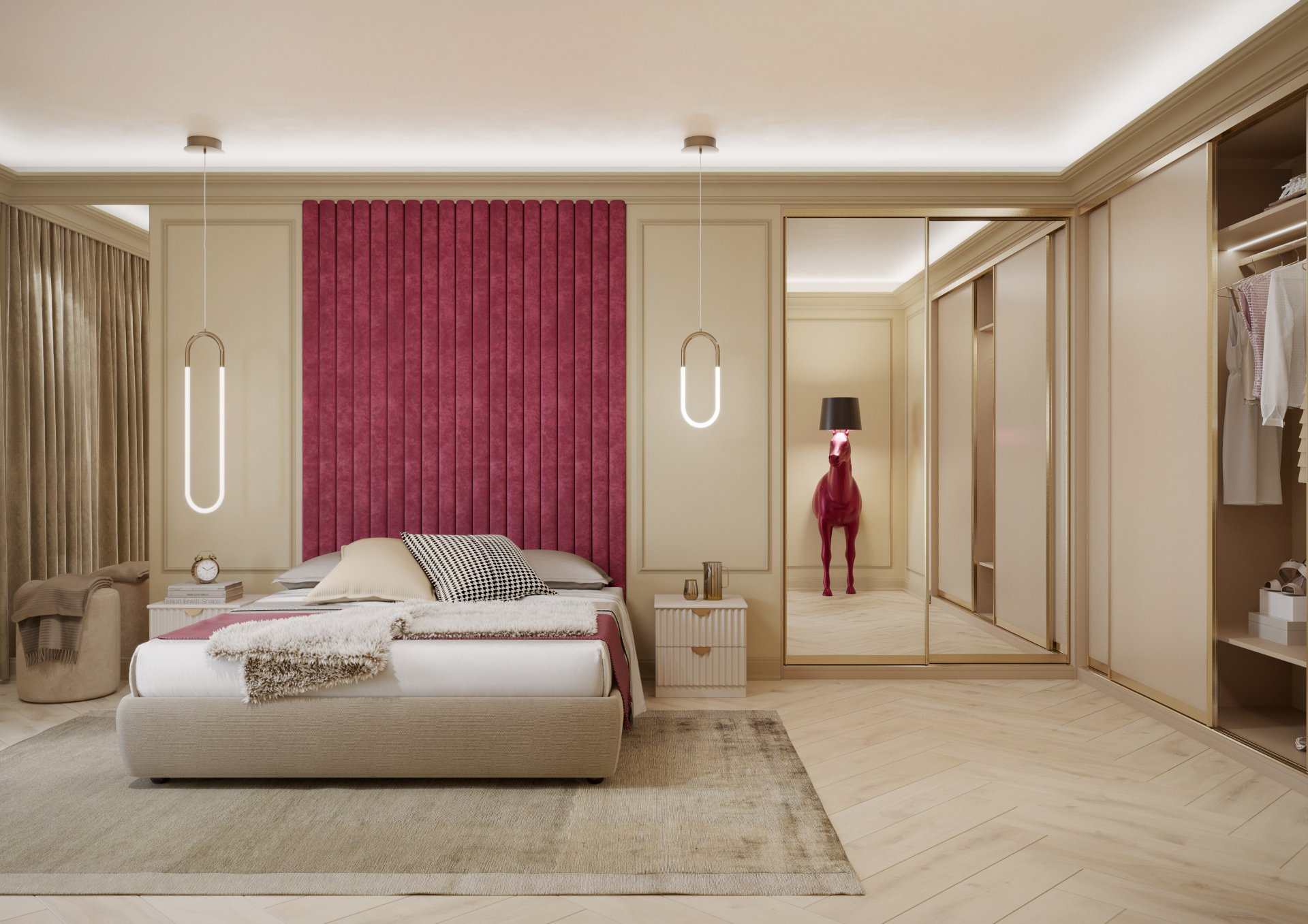 W narożniku widocznej powyżej sypialni spotykają się dwa rodzaje frontów: szklane i lustrzane. Mogłyby też być np. okleinowane albo lakierowane, co dla aranżacji wnętrza stwarza wyjątkowe możliwości kreowania różnych stylów przestrzennych. Bez względu na rodzaj wykończenia, drzwi domkną się harmonijnie dzięki profesjonalnemu systemowi drzwi przesuwnych narożnych. Jednym z najpopularniejszych stosowanych przez projektantów jest Lazuryt od marki Komandor, który można stosować w przypadku szaf narożnych zewnętrznych i wewnętrznych. Ale uwaga! W szafach narożnych można również łączyć ze sobą różnego rodzaju fronty, na przykład na poszczególnych bokach mebla. Wszystko w zależności od preferencji, potrzeb oraz układu funkcjonalnego pomieszczenia.