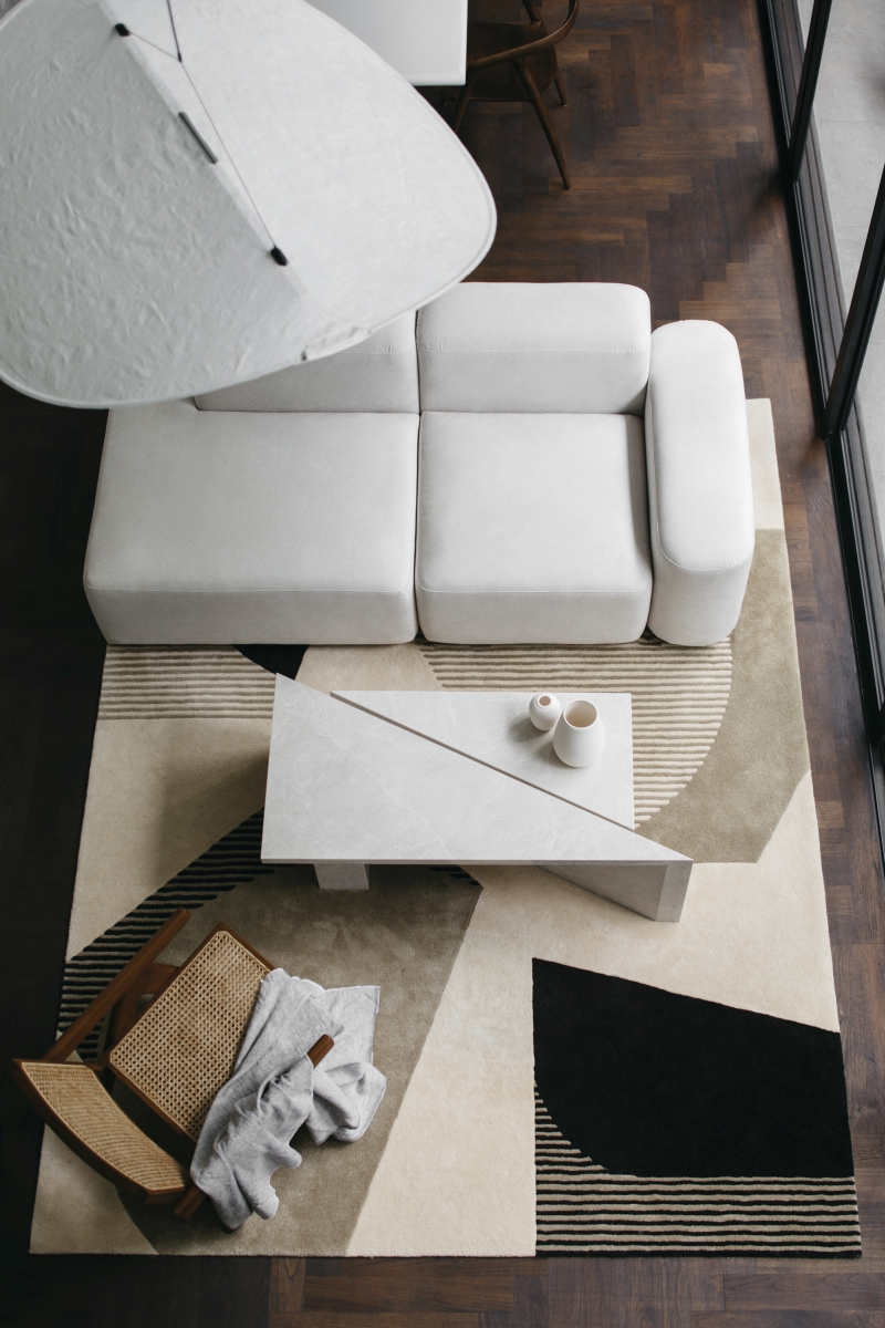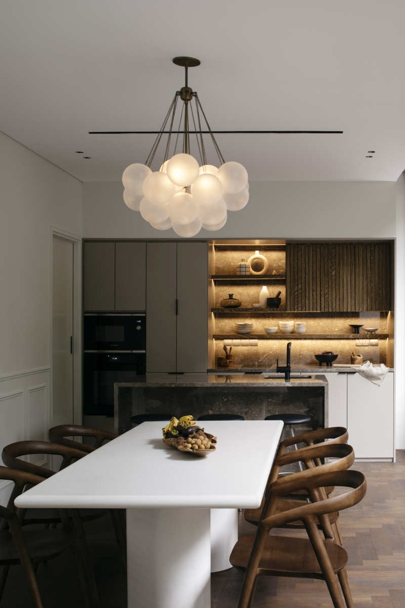 Choć projekt nie odwołuje się wprost do jednego stylu, widać w nim dążenie do równowagi – między ciężarem a lekkością, geometrią a miękkimi liniami. Masywny, wykonany na zamówienie stół jadalniany z betonu wzmacnianego włóknem szklanym zestawiono z eteryczną lampą wiszącą Cloud 19 marki Apparatus. Kanciaste formy stolików kawowych z marmuru spider kontrastują z miękką sylwetką fotela Chandigarh Easy Chair Pierre’a Jeannereta oraz kompaktową sofą w strefie dziennej.