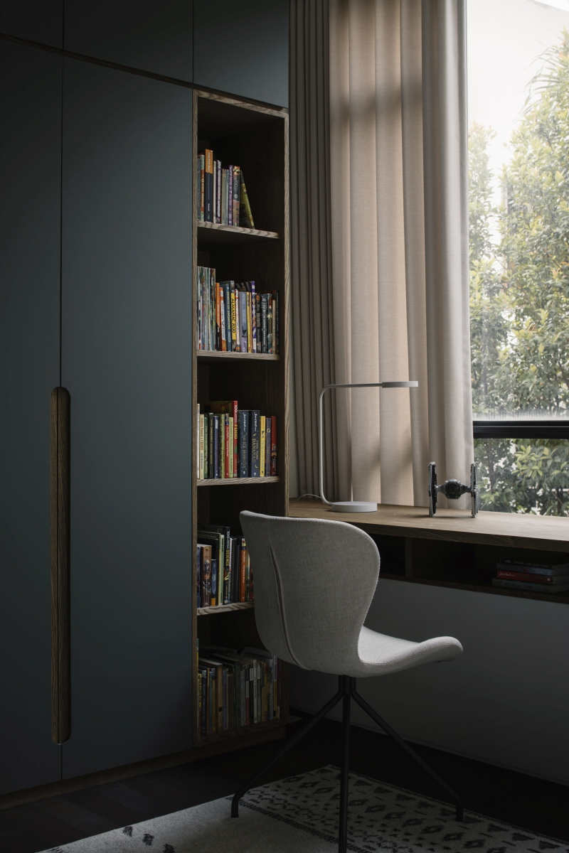Drugie piętro, z biblioteką i gabinetem, zostało celowo włączone w ten dialog. Otwarte na salon poniżej, pozwala na wizualny i dźwiękowy kontakt między kondygnacjami. Układ mebli, zarówno wewnątrz, jak i na patio, sprzyja rozmowie i współobecności, niezależnie od tego, gdzie aktualnie znajdują się domownicy.