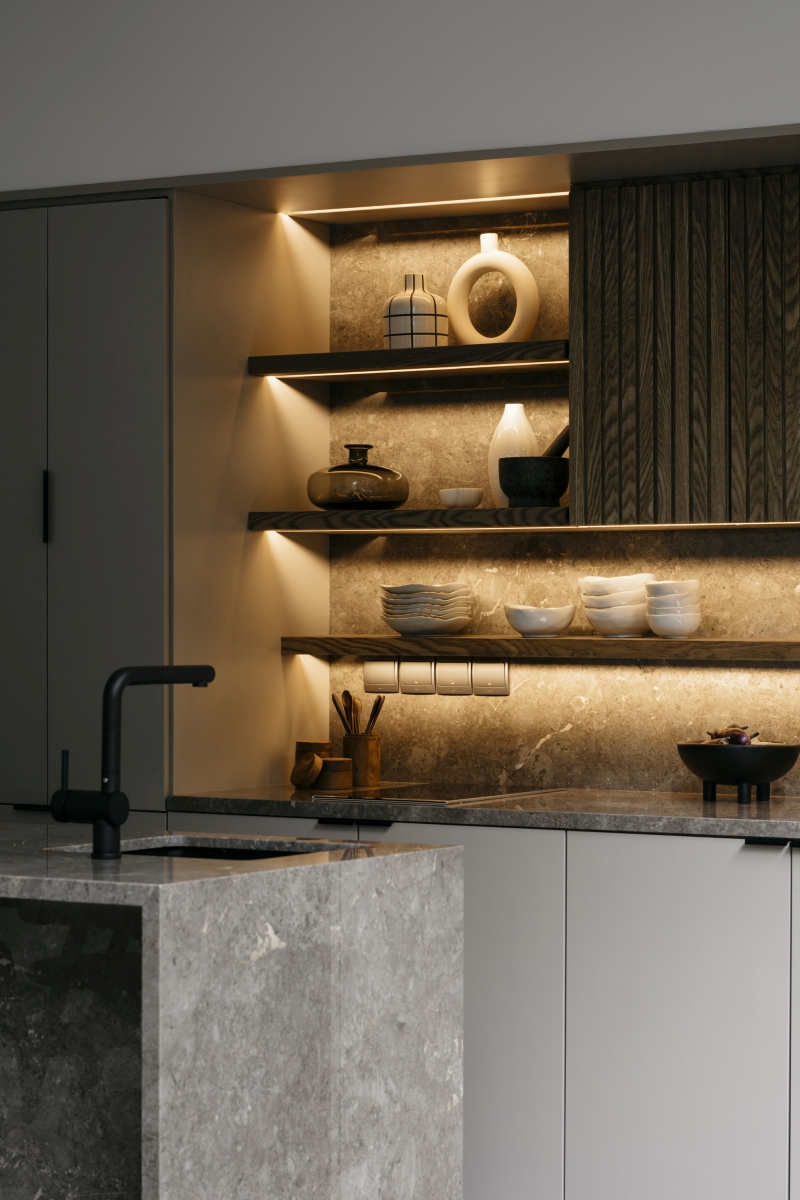 Wykończenia drewnianych powierzchni powierzono produktom Rubio Monocoat, które idealnie wpisały się w filozofię projektu. Olej Oil Plus 2C zastosowany na podłogach z teaku birmańskiego w kolorze Black nadaje im głębi i eleganckiej ciemnej tonacji, jednocześnie podkreślając naturalne słoje drewna. W kuchni oraz w zabudowach z forniru jesionowego pojawia się odcień Castle Brown – ciepły, szlachetny, wzmacniający wrażenie rzemiosła i materialności.