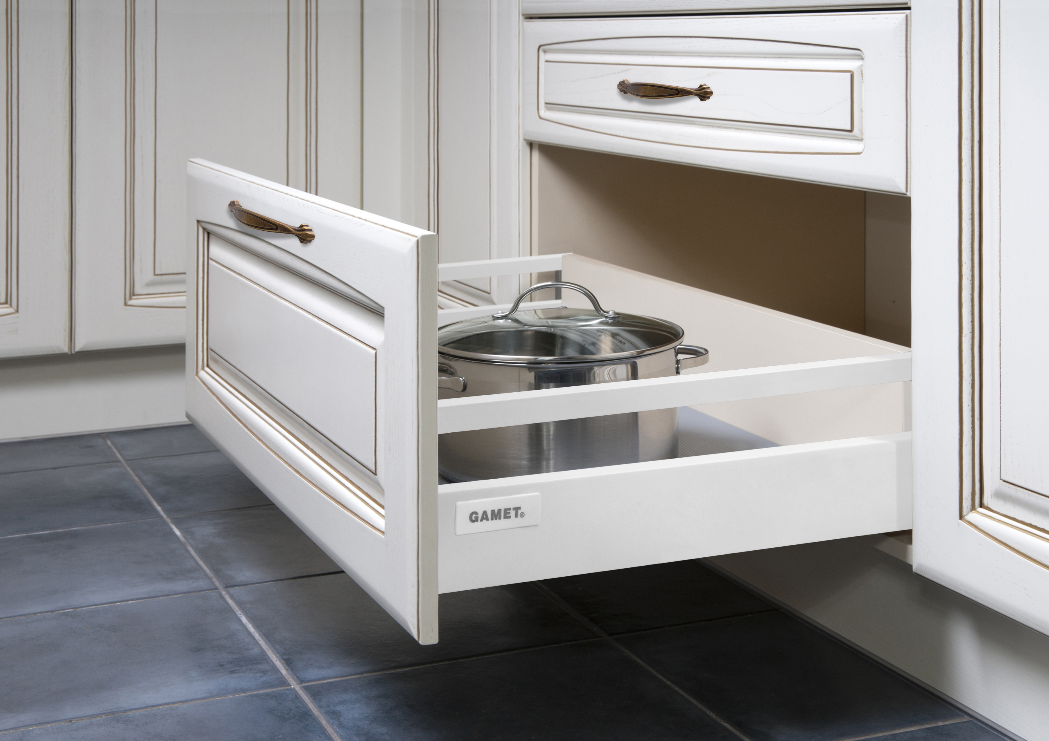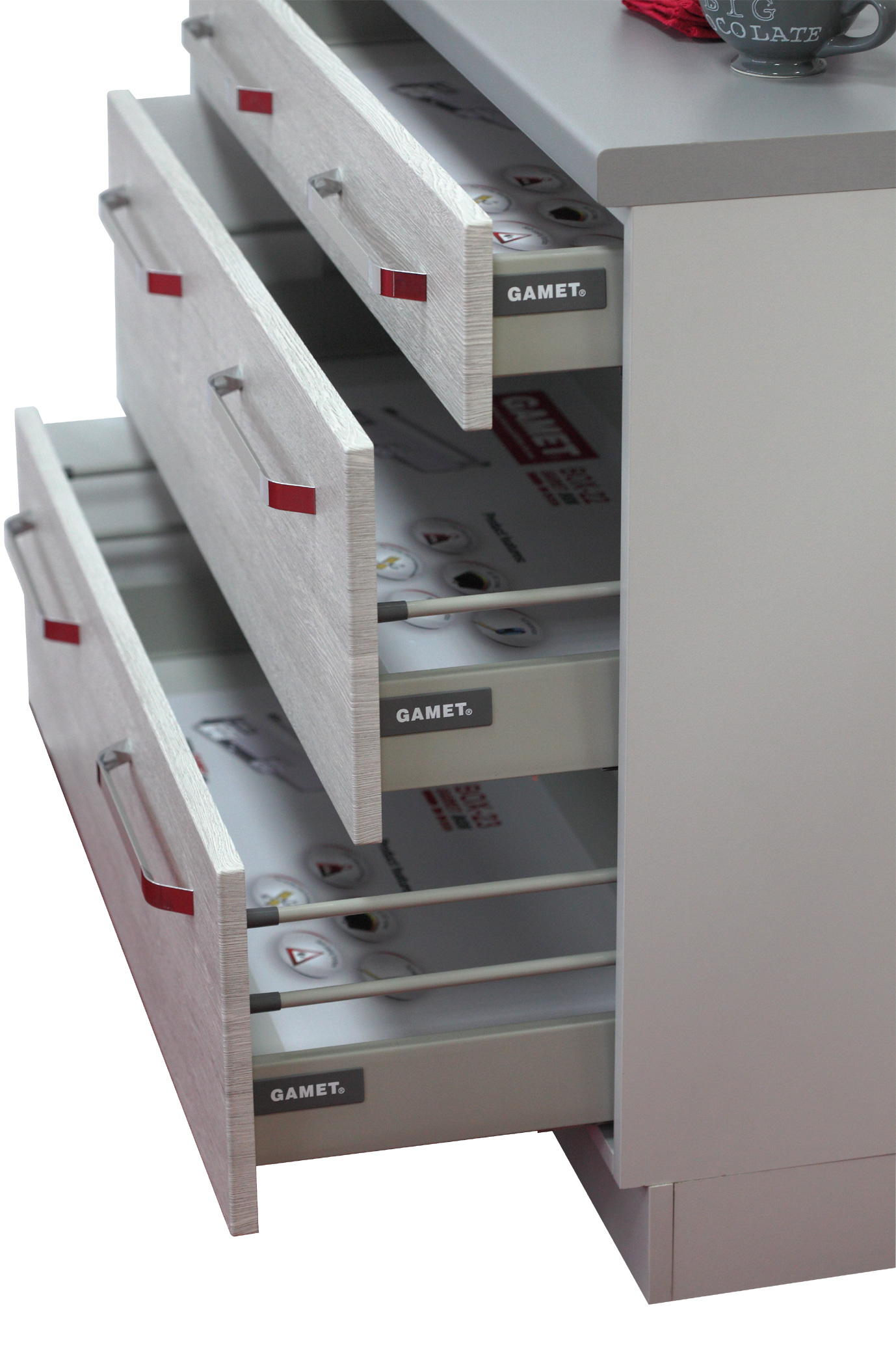 GAMET BOX jest dostępny w trzech wysokościach: 100, 154 i 218 mm oraz dwóch kolorach, białym i szarym. Oferta jest wzbogacona o dodatkowe akcesoria: nakładki na boki szuflad oraz wewnętrzne organizery ułatwiające utrzymanie porządku. GAMET BOX jest łatwy w montażu i regulacji, a sama konstrukcja umożliwia pełen wysuw i swobodny dostęp do całej zawartości szuflady.