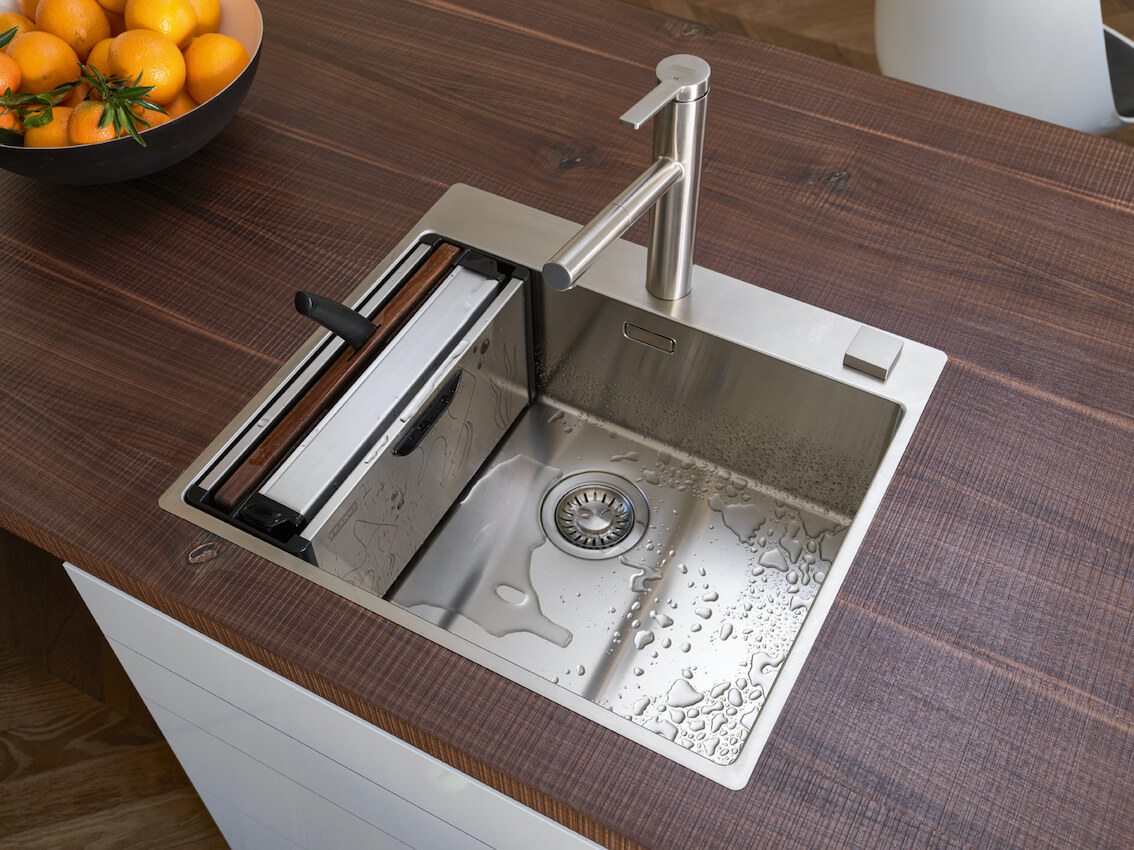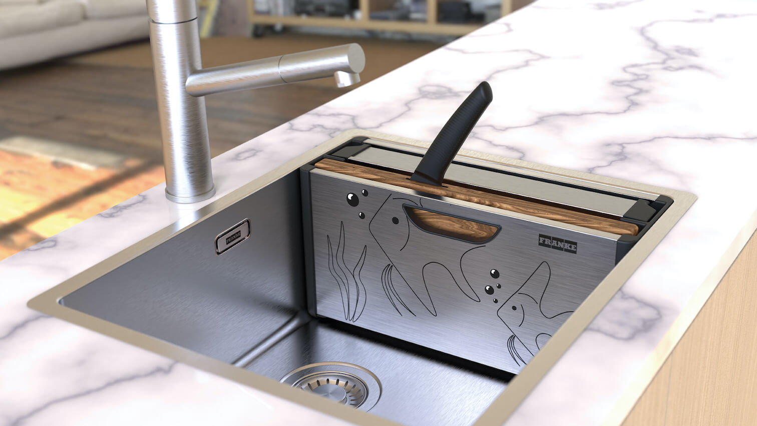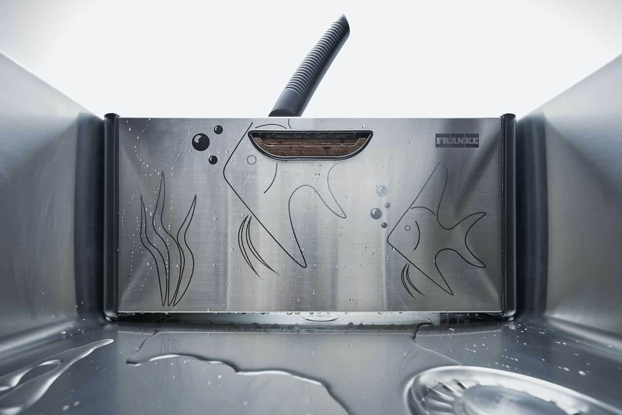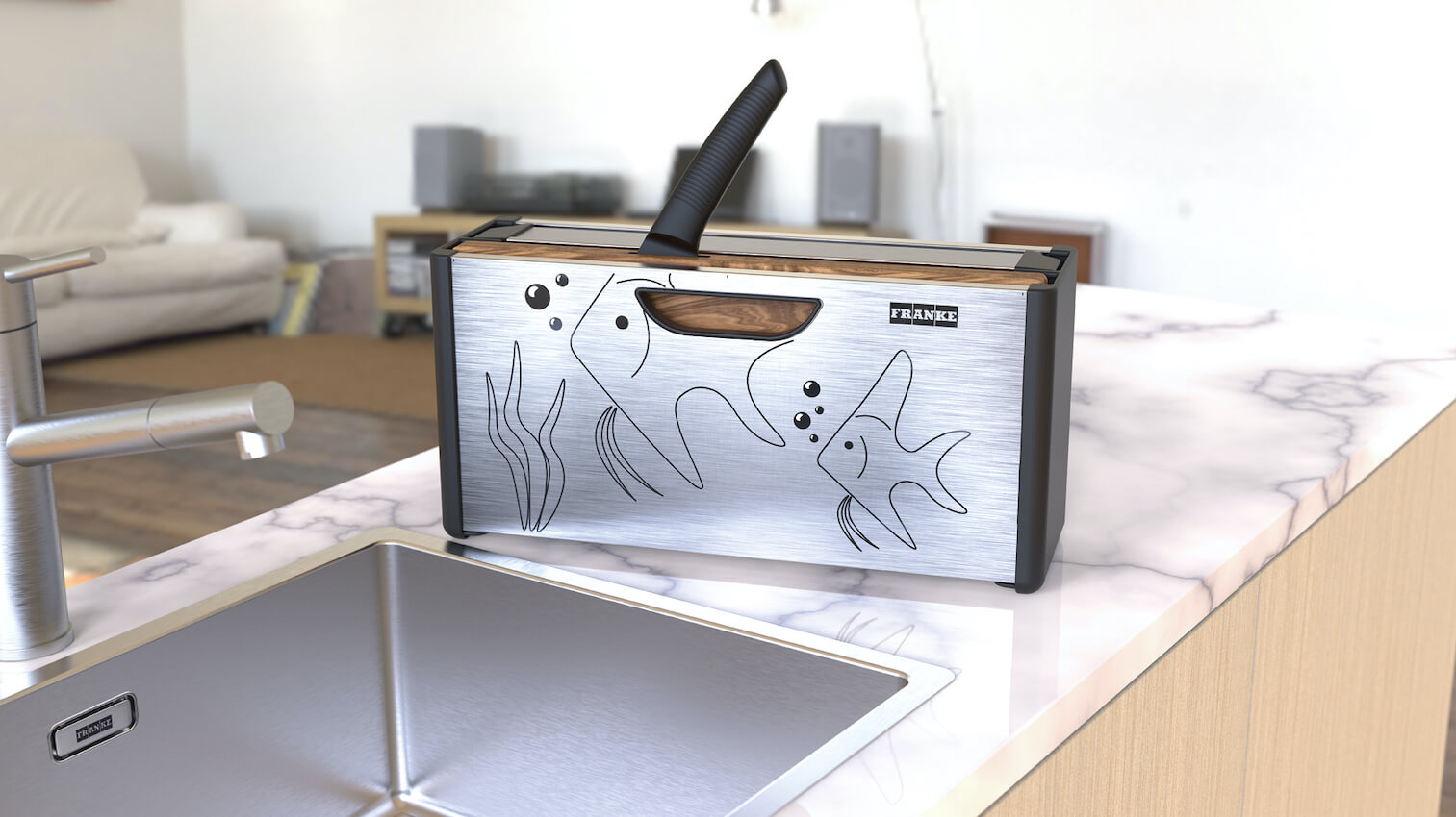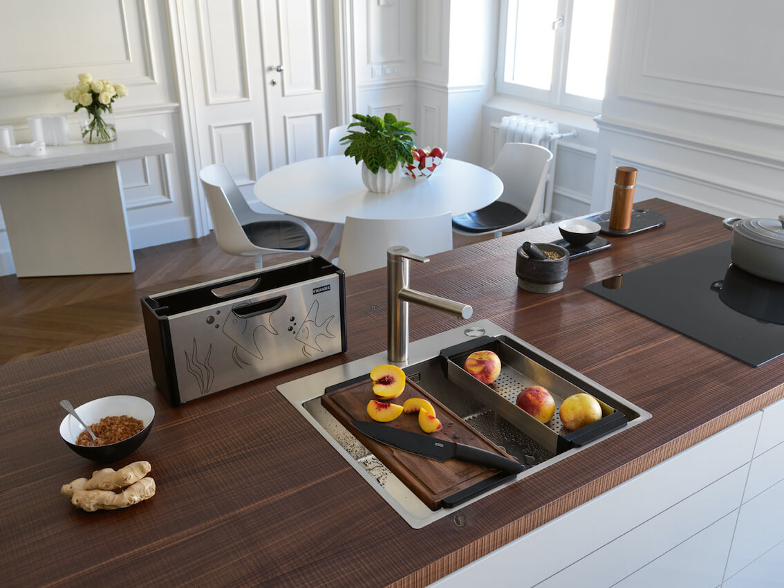 Designerski organizer możemy postawić również na blacie. Tam nie tylko spełni swoją funkcję, ale również ożywi aranżację kuchni. Tym bardziej, że jego boki zdobi intrygująca grafika, której przestrzennym elementem jest… rękojeść noża. Nowość to połączenie innowacji z dziedzictwem firmy Franke, dla której stal szlachetna jest obiektem zainteresowania od ponad 100 lat. To także kolejne, po Box Center, kreatywne i ergonomiczne rozwinięcie funkcji tradycyjnego zlewozmywaka.