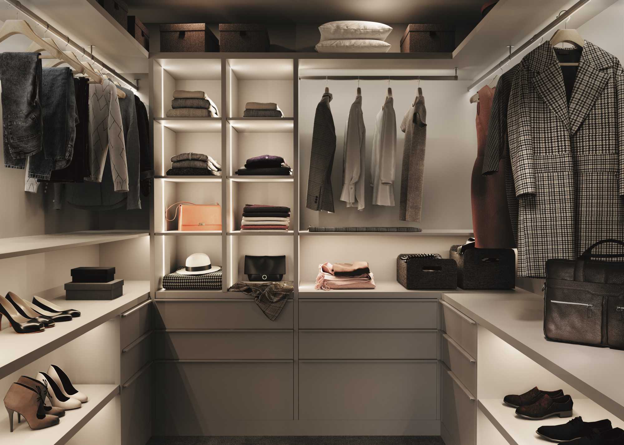 W garderobie czy wysokiej szafie zabudowanej sprawdzi się również pantograf. Jego zaletą jest ergonomiczne wykorzystanie górnej części przestrzeni. Zapewnia przejrzystość, gdyż ubrania są lepiej widoczne oraz nie gniotą się. Jednym wygodnym pociągnięciem możemy obniżyć górny drążek ubraniowy i mieć dostęp do tej części garderoby.