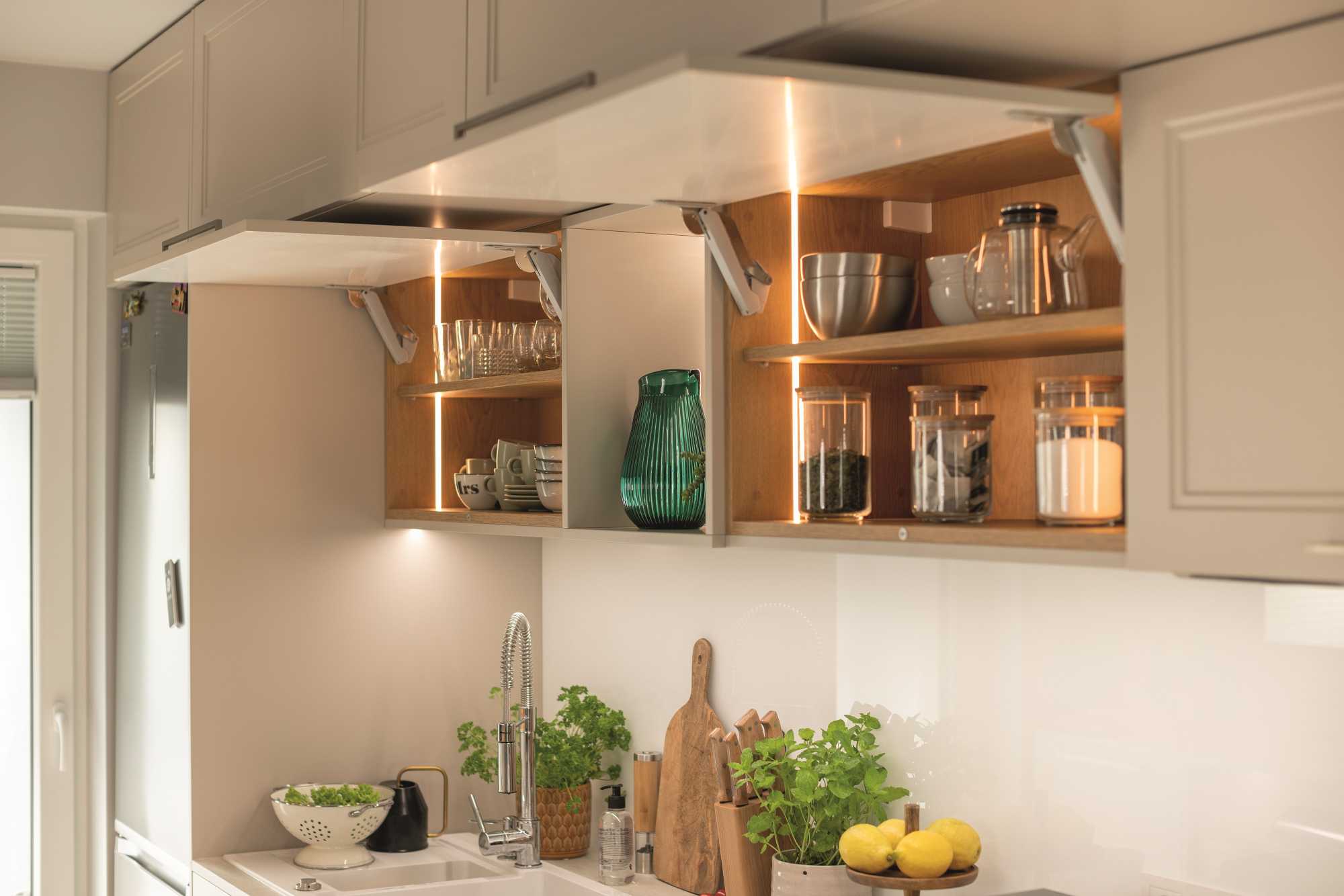 Podobnie sprawa ma się w kuchni, gdzie znaczącą rolę odgrywają ukryte w szafkach zawiasy i podnośniki do klap. To kolejne miejsce, gdzie warto przede wszystkim postawić na jakość i niezawodność, by mieć rozwiązania na lata. Warte uwagi są systemy, które zajmują jak najmniej powierzchni użytkowej – zyskujemy wówczas więcej miejsca na przechowywanie. Najlepiej, jeśli idą w parze z eleganckim i dyskretnym designem. – Podnośnik Free Space charakteryzuje się wyjątkowo kompaktowym rozmiarem. Jest uniwersalny i wszechstronny, daje użytkownikom wybór spośród aż czterech możliwości regulacji: wysokości, bocznej, nachylenia frontu czy siły – mówi Kinga Przymuszała.