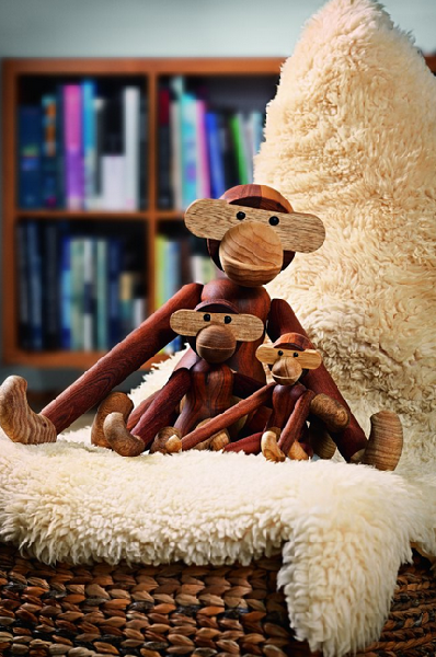 …ale też to, co się w nich znajduje. A w ponad 300 tys. domów znajdziemy piękną, drewnianą zabawkę, która uznawana jest za ikonę duńskiego, a tym samym skandynawskiego projektowania: Małpkę stworzoną przez Kay’a Bojesena. Dekoracja ujrzała światło dzienne w 1951 roku, czyli ponad 60 lat temu. Od tego czasu na całym świecie uważana jest za klasykę designu. Sam Kay Bojesen, nazywany tym, który wprowadził uśmiech do duńskiego projektowania, stworzył tę niezwykłą drewnianą zabawkę dla swojego dziecka. Małpka wykonana jest z drewna tekowego i składa się z połączonych ze sobą, ruchomych elementów. Dzięki odpowiednio zakończonym kończynom bez obaw można ją zaczepić na przykład na domowej półce.