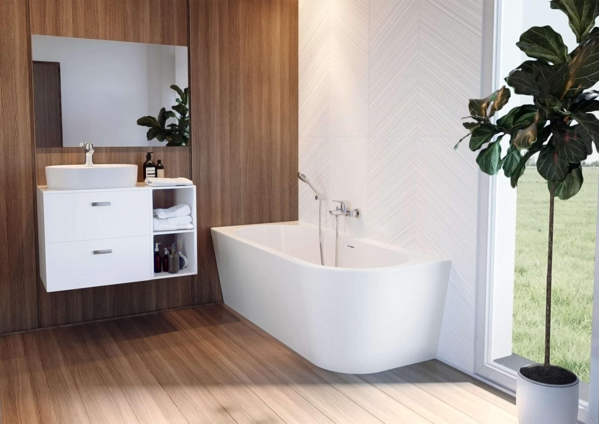 Modne kolory bieli w połysku oraz wykończenia drewna brzozy, dębu lub cedru ocieplające wnętrze tworzą popularną i uniwersalną kompozycję. Do wyboru są dwa warianty. Lakierowana na wysoki połysk biel lub jej połączenie z ciemniejszym lub jaśniejszym wykończeniem drewna.