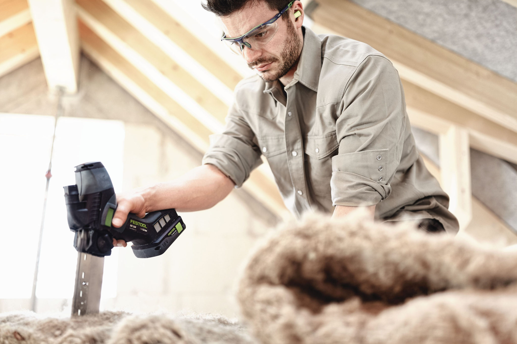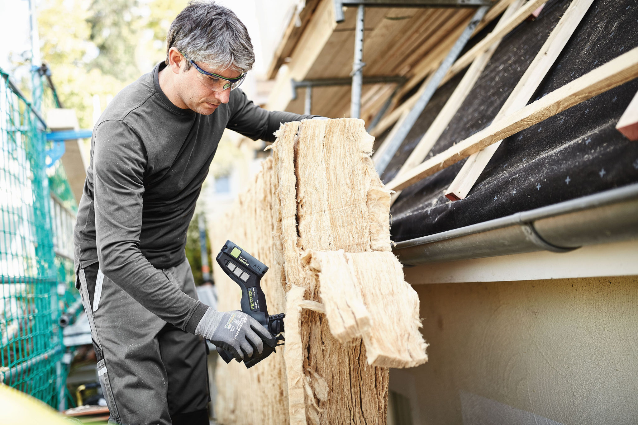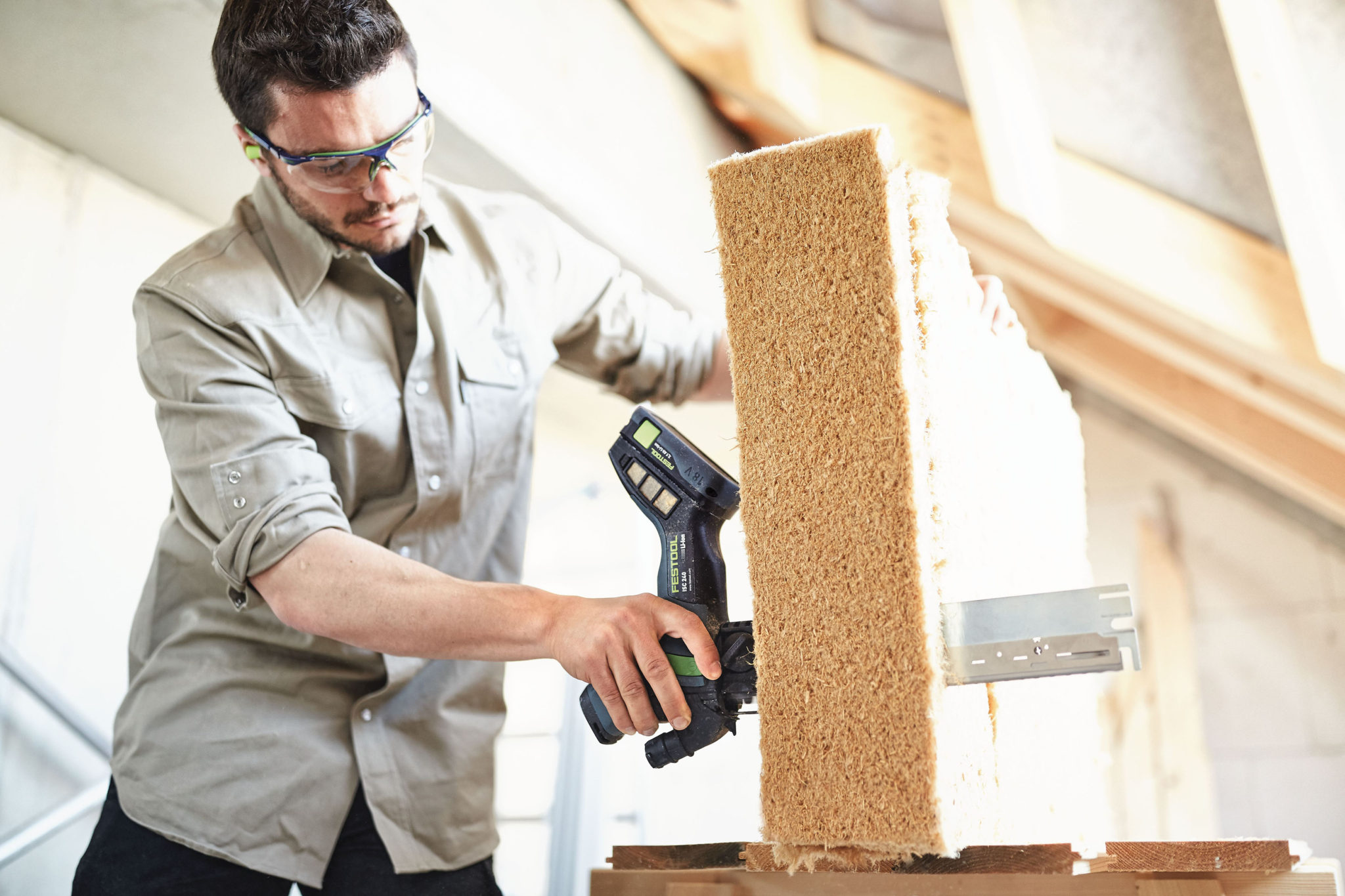 W wypadku wełny szklanej i mineralnej używa się głównie standardowego noża do materiałów izolacyjnych. Jednak wraz ze wzrostem grubości materiału jego wydajność i precyzja – zwłaszcza gdy ważne jest zachowanie kąta – maleją. Dlatego fachowcy sięgają po coraz droższe i nieelastyczne urządzenia. Są one ciężkie i duże, a więc mało praktyczne. Te same wady mają powszechnie stosowane narzędzia do obróbki elastycznych materiałów izolacyjnych z włókien naturalnych, jak np. elektryczne piły szablaste typu lisi ogon. Pozbawiona ich jest natomiast akumulatorowa pilarka Festool ISC 240. Zasilanie akumulatorowe pozwala na cięcie w miejscach bez dostępu do zasilania sieciowego, np. na budowie i równocześnie gwarantuje pracownikom swobodę ruchu – na dachu, na rusztowaniu, na podłożu. Niewielka waga narzędzia, gumowane powierzchnie, a także doskonale wyważona konstrukcja zapewniają maksymalny komfort pracy nawet podczas obsługi jedną ręką. „Pilarka doskonale się sprawdza nawet jeśli mamy do czynienia z trudnymi do cięcia elastycznymi materiałami izolacyjnymi z włókien naturalnych, jak miękkie włókna drzewne lub konopne. Dzięki niej obróbka jest szybsza, co z kolei sprawia, że materiały te stają się bardziej interesujące dla rzemieślników i klientów” – tłumaczy Sławomir Trojan.