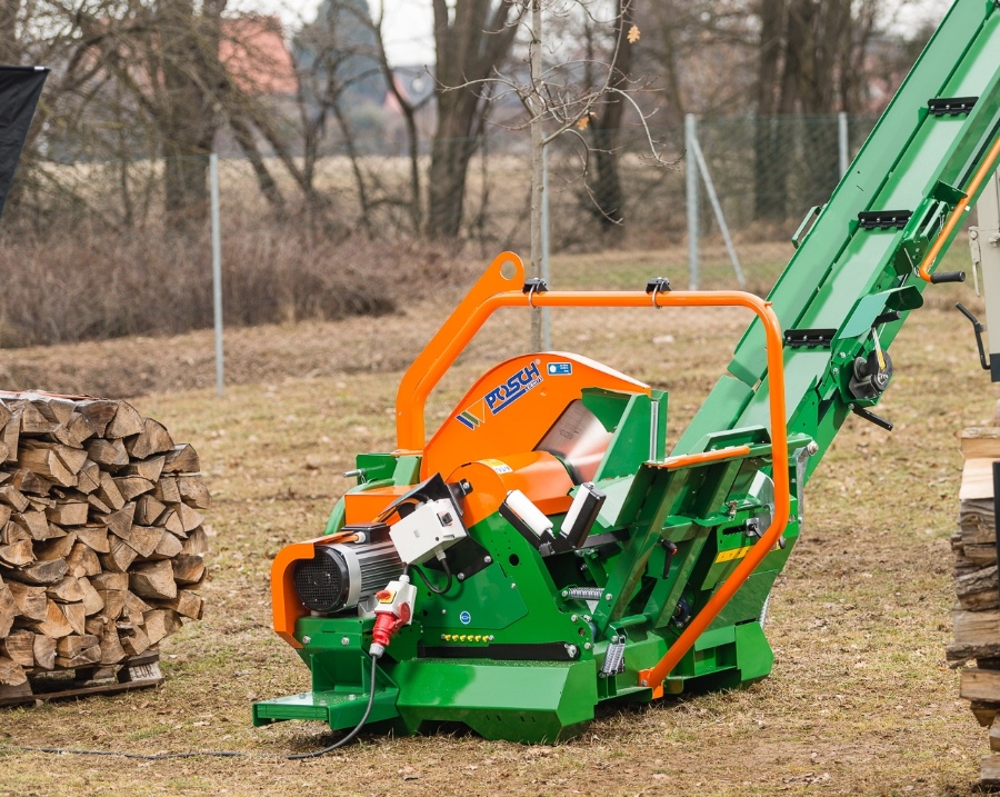 Jednym z flagowych produktów marki Posch jest też łatwa w obsłudze i wydajna pilarka wahaczowa PLUS z taśmociągiem, przeznaczona do drewna opałowego, która tnie polana i drewno okrągłe do Ø 24 cm. Drewno do cięcia podawane jest przez niezwykle lekki wahacz aż do tarczy piły i już jako pocięte ładowane za pomocą taśmociągu. Maszyna wyposażona jest w lekko pracującą kołyskę, wspomaganą sprężyną i łożyskowaną na łożyskach kulkowych z amortyzacją w pozycjach krańcowych. Pilarka ma napęd ciągnikowy przez aluminiową przekładnię kątową i pas klinowy lub silnik elektryczny i pas klinowy. Tarcza pilarki wykonana jest ze stali chromowej Ø 70 cm, a maksymalna średnica cięcia wynosi 24 cm. Urządzenie wyposażone jest w ogranicznik wzdłużny do dokładnego cięcia długości w przedziale 15-60 cm, z możliwością regulacji bezstopniowej za pomocą układu elektronicznego CutControl.