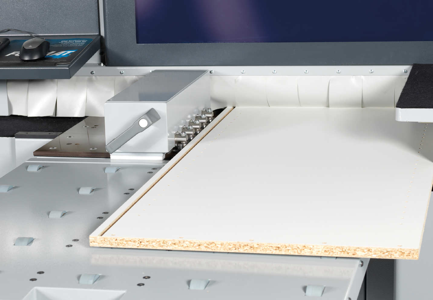 Materiał transportuje się w maszynie na leżąco, a jego podwójne prowadzenie w osi X realizują dwa chwytaki. Każdy z nich napędzany jest z wykorzystaniem listwy zębatej z zębami ewolwentowymi, co gwarantuje przesuw bez drgań. Dodatkowo stabilne prowadzenie materiału z przodu i z tyłu wspierają, dociskające go z góry, pneumatyczne dociski rolkowe. Dzięki nim podczas obróbki materiału, którą wykonują pracujące od góry zespoły robocze, nie dochodzi do jego przesunięcia w żadnej płaszczyźnie. Przekłada się to na dokładne wyniki pracy. Płynnie regulowane prędkości posuwu umożliwiają optymalne dopasowanie ich do zastosowanego materiału i typu obróbki. Niewątpliwie pozwala to osiągnąć jak najlepszą jakość produktu finalnego.