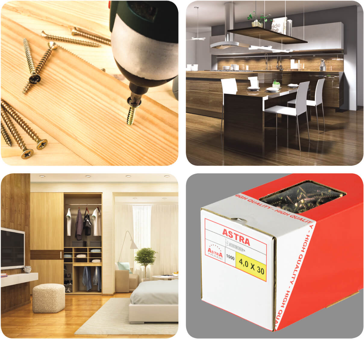 Wkręty Astra przeznaczone są do stosowania w stolarstwie, budownictwie i wielu innych branżach pokrewnych. Mimo braku zastosowania specjalnych rozwiązań patentowych cechują się one wyjątkową jakością wykonania. Składają się na to szczególnie dobrane proporcje pomiędzy średnicą zewnętrzną gwintu i średnicą rdzenia, aby zmaksymalizować siłę utrzymania w drewnie. Gwint dochodzący do samego szpica daje efekt natychmiastowego „zaczepienia” w drewnie od pierwszego obrotu wkrętarki. Gniazda typu Pozidrive wykonane w możliwie najgłębszej wersji niwelują niekorzystny efekt „wyskakiwania” bita z gniazda podczas wkręcania. Utwardzenie powierzchni wkrętów wykonane z wykorzystaniem najnowszych technik hartowania z węgloazotowaniem. Pokrycie galwaniczne w wersji ocynku z pasywacją żółtą i białą niebieską dają duże możliwości doboru kolorystycznego. Dodatkowe pokrycie powierzchni gwintu woskiem zwiększa poślizg i zmniejsza siłę potrzebną do ich wkręcenia. Wygodne opakowania z okienkiem są dobrze dopasowane do potrzeb klientów, dając się każdorazowo komfortowo zamykać.