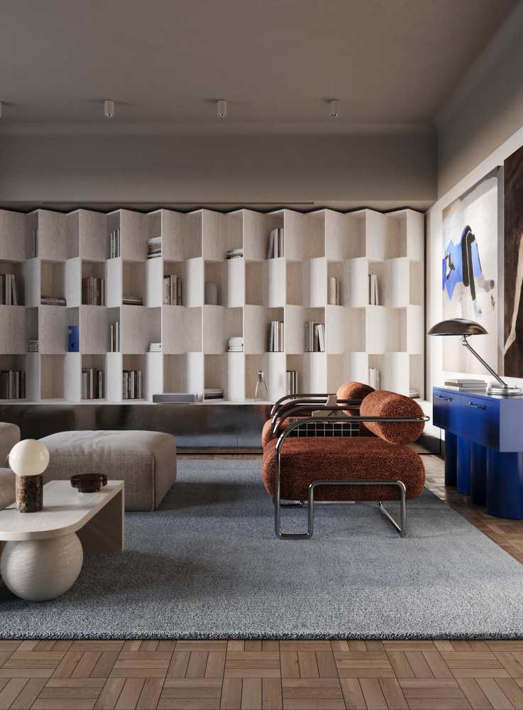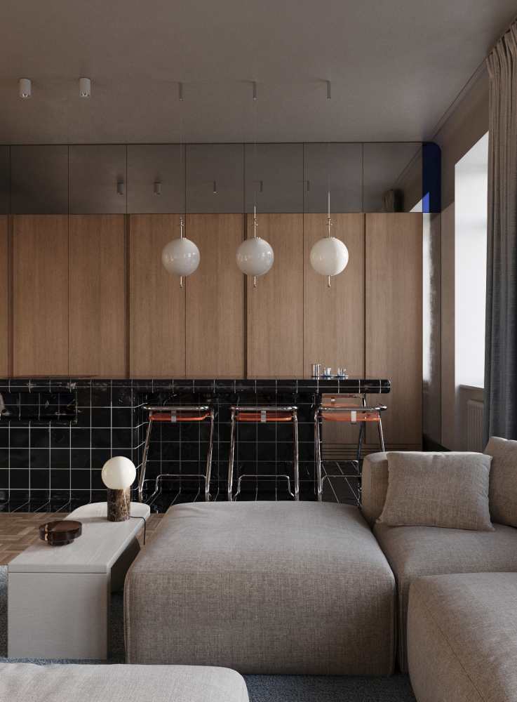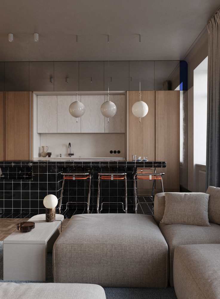 Punktem wyjścia do wykreowania wizji wnętrza były obrazy Teresy Pągowskiej (zdobiące ściany salonu). Przestrzeń miała być idealnym zestawieniem formy, kompozycji i koloru z wykorzystaniem sylwetki człowieka, który staje się najważniejszą i nieodłączną częścią projektowanej przestrzeni, gdy w niej ktoś zamieszka…. A zamieszkać w tym apartamencie mogłaby para, która kocha sztukę. Całość garściami czerpie z designu typowego dla lat 70. i 80. W strefie kuchennej na pierwszy plan wysuwa się wyspa wyłożona drobnymi płytkami z kontrastującą białą fugą. Tłem dla niej jest minimalistyczna zabudowa skąpana w ciepłym dekorze Legno Jasne R48026, o linearnym, delikatnym układzie rysunków. Ciekawym i przemyślanym zabiegiem jest ukrycie strefy roboczej. By oddać się przyjemności gotowania, wystarczy otworzyć drzwi, za nimi zaś kryją się funkcjonalne szafki. Wewnętrzną część kuchenną zaprojektowano w zdecydowanie jaśniejszej tonacji – to zasługa dekoru Willow Biały R55072, który wyglądem przypomina bieloną sklejkę. Kuchnia płynnie łączy się z częścią wypoczynkową, w której królują fotele obite tkaniną boucle na stalowych stelażach, nadających im lekkości. Z pomarańczem obić kontrastuje niebieska konsola i błękit dywanu.