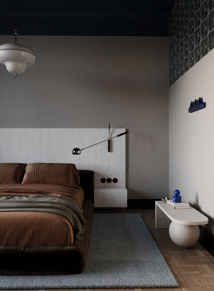 W sypialni ponownie pojawia się dekor Willow Biały R55072 – zdobiąc tym razem zagłówek łożka. Ten mebel został pokryty brązowym welurem, dzięki czemu zdaje się zapraszać do słodkiego lenistwa. Toaletka oddziela strefę garderoby i sypialną. Istotnym elementem wnętrza jest zabudowa pokryta stalową blachą, w której sypialnia delikatnie się odbija. Ważnym miejscem tego mieszkania jest łazienka. Architektce zależało na zapewnieniu tu dostępu do naturalnego światła – stąd luksfera, która zaprasza tu promienie słońca. To wnętrze jest luźnym nawiązaniem do morskich pejzaży. Idealnie wpisał się tu dekor Horyzont U18029 firmy Pfleiderer – nie tylko z nazwy, ale i barwy. Posadzka przypomina spękaną ziemię, a nad nią góruje dekoracyjna lampa przypominająca zachodzące słońce.