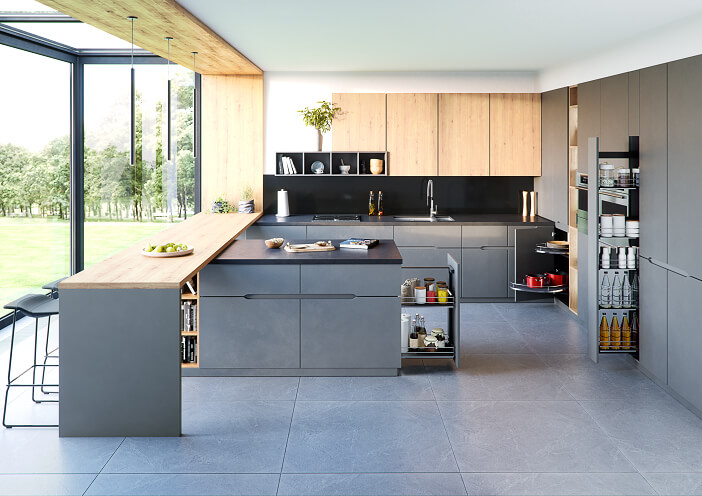 Znacznie bardziej komfortowe są układy zabudowy w kształcie L lub II gdzie meble tworzą dwie linie, odpowiednio – prostopadłą lub równoległą. W tym wypadku znacznie skraca się dystans, który należy pokonać podczas gotowania, a wszystkie kluczowe urządzenia są pod ręką. To dobre rozwiązanie w nieco większych pomieszczeniach na planie kwadratu lub prostokąta. Rozwinięciem tych kuchni są jeszcze wygodniejsze kuchnie w kształcie U lub G. Pozwalają one na stworzenie większej liczby szafek i zwiększenie przestrzeni do przechowywania. A przecież rzadko się zdarza, że narzekamy na nadmiar miejsca. Z drugiej strony, w kuchniach tych musimy się liczyć z koniecznością zagospodarowania szafek narożnych.