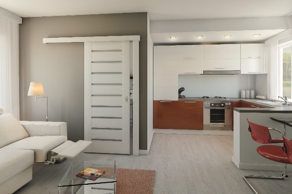 Kolejna sprawa to decyzja, czy wybrać drzwi otwierane do środka pomieszczenia, czy na zewnątrz? Tutaj warto zwrócić uwagę na ciągi komunikacyjne. Dobrze jest, gdy skrzydła otwierają się w stronę ściany i nie blokują innych drzwi. W niektórych pomieszczeniach trzeba uwzględnić też kwestie bezpieczeństwa – w łazience na przykład drzwi powinny otwierać się na zewnątrz. Otwierane w ten sposób skrzydła to też sposób, by zaoszczędzić trochę miejsca w domowych pomieszczeniach. Alternatywą są np. drzwi przesuwne naścienne lub wewnątrzścienne, które zajmują niewielką powierzchnię. Skrzydła Porta KONCEPT w wersji przesuwnej wyglądają efektownie i pozwalają subtelnie ukryć dodatkowe pomieszczenie, np. garderobę, spiżarnię czy składzik.
