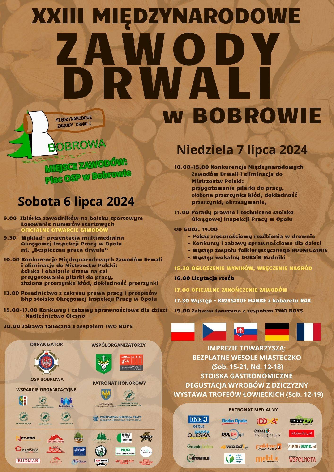 XXIII Międzynarodowe Zawody Drwali w Bobrowie (gmina Rudniki) odbędą się 6 i 7 lipca 2024 roku. Na spotkaniu oprócz samej rywalizacji zawodników będzie wiele innych atrakcji. Dokładny program imprezy znajduje się poniżej. Serdecznie zapraszamy.