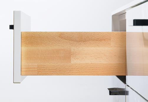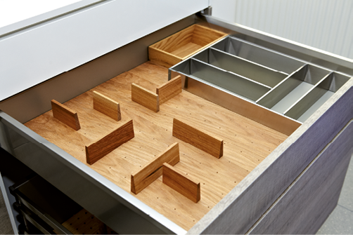 Jeśli nie potrzebujemy w szufladzie organizera, ale chcielibyśmy zastosować drewniane akcenty, można surowiec ten wykorzystać do budowy frontów lub boku szuflady.