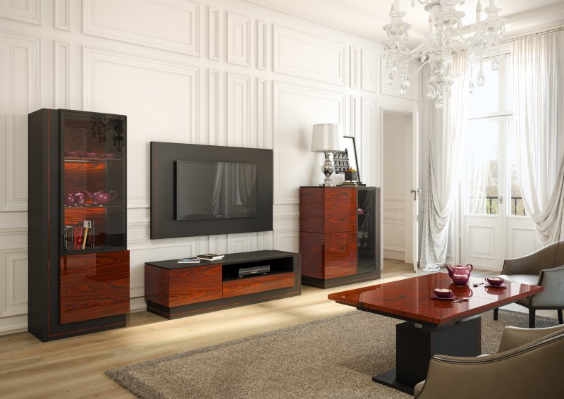 Elegante to meble przeznaczone do salonu o wyjątkowym wzornictwie. Jednym z największych atutów kolekcji jest wybarwienie występujące w dwóch zestawieniach kolorystycznych: orzech amerykański – antracyt, palisander Rio – antracyt. Bardzo modne, błyszczące powierzchnie frontów o pięknych wzorach usłojenia zestawione z matowymi czarnymi powierzchniami korpusów i blatów oraz ciemnym szkłem antisol doskonale podkreślają niepowtarzalny charakter całej linii. Prostota formy, różnorodność materiałowa (okleina naturalna/ modyfikowana, płyta lakierowana, szkło antisol) i kontrasty kolorystyczne to cechy charakterystyczne Elegante. W kolekcji znajdują się między innymi: witryny, witrynki, szafki, panele RTV, komody, barki, regały i stoły – prawie wszystkie bryły w kilku wymiarach i wariantach (wiszące, stojące, otwierane na prawą i na lewą stronę). Korpusy i blaty wykonano z płyty meblowej pokrytej lakierem matowym, zaś fronty z płyty meblowej na wysoki połysk okleinowanej okleiną naturalną lub modyfikowaną. Motywem dekoracyjnym przewijającym w całej kolekcji jest element korpusu w kształcie litery L o różnych długościach ramion dopasowanych do wielkości bryły, a także cienki pasek (wstawka), która biegnie przez jego środek. Meble posiadają też szereg funkcjonalnych rozwiązań, takich jak: system otwierania szuflad i drzwi push to open czy energooszczędne, liniowe oświetlenie LED z ukrytym włącznikiem zbliżeniowym.