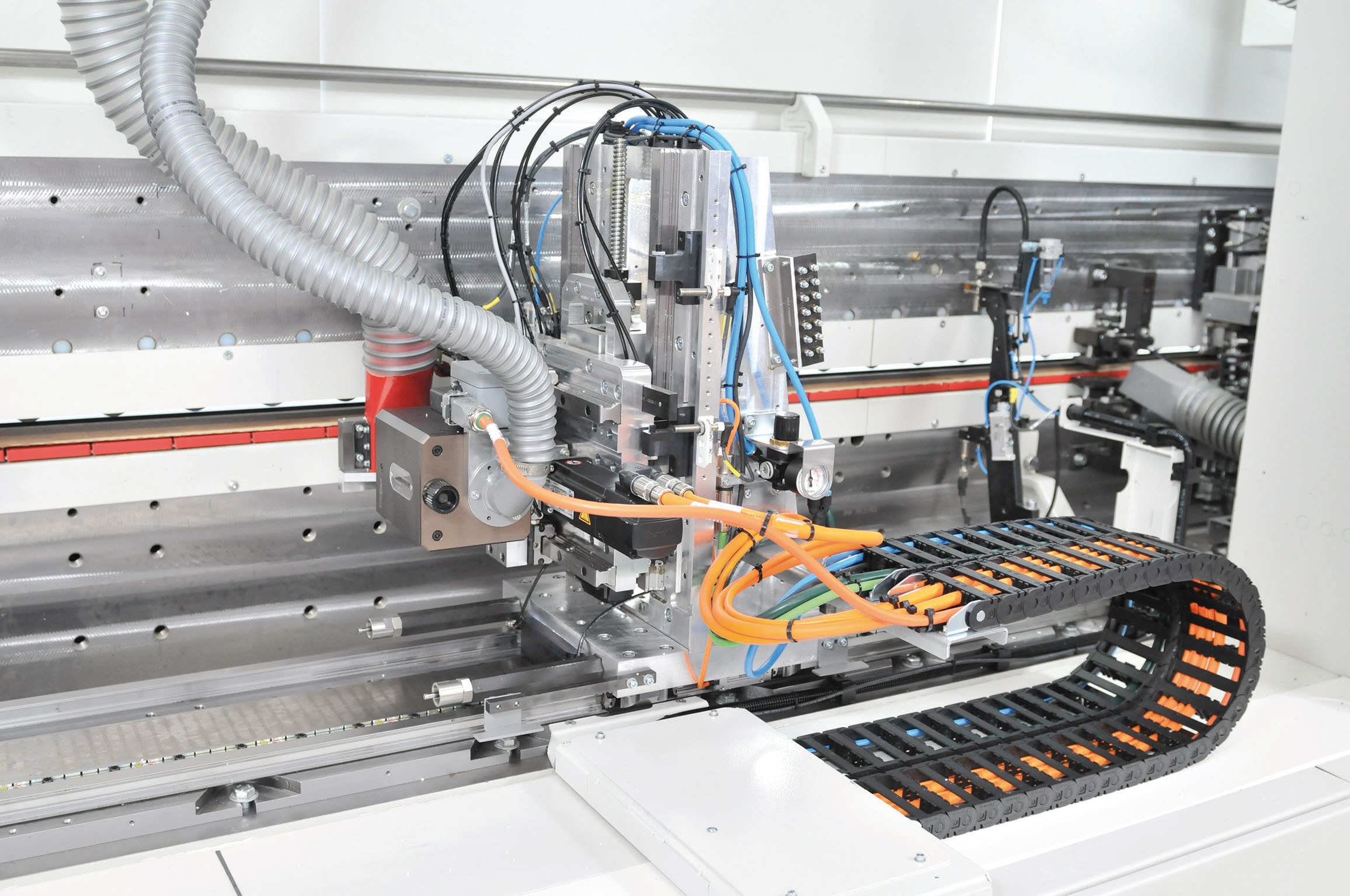 Aby maszyna mogła wykonywać liczne etapy obróbki, ma dostęp do różnych narzędzi i jest także wyposażona w kilka agregatów do precyzyjnej obróbki, takich jak agregat do zaokrąglania narożników wewnętrznych I-KFA, cykliny profilowe i płaskie, agregaty polerskie oraz agregaty szczotkowe. Maszyna do softformingu przy użyciu grubych obrzeży ma łączną długość ponad 40 metrów. „To słuszny rozmiar jak na maszynę do obróbki elementów meblowych” – mówi Dennis Reddig. „Ale trzeba powiedzieć, że jest to rozwiązanie specjalne, jedyne w swoim rodzaju”.