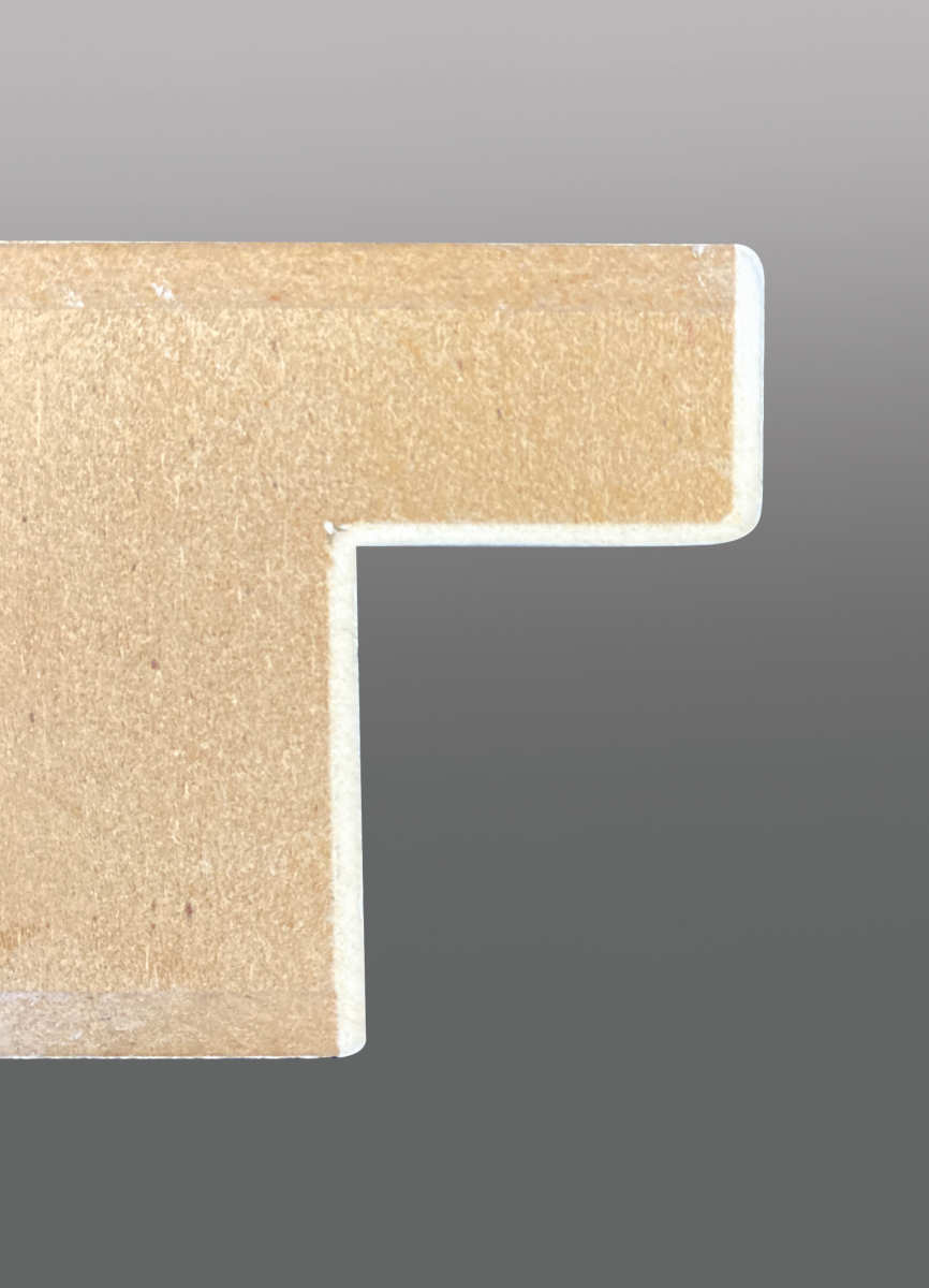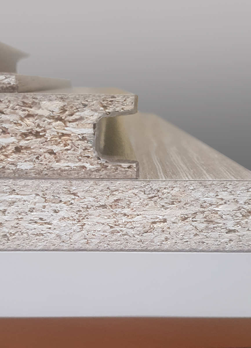 Softforming to oklejanie krawędzi opływowych kształtów, do którego producenci obrzeży oferują specjalne, cienkie i wyjątkowo elastyczne materiały obrzeżowe. Jednak w tym przypadku nie było to odpowiednie rozwiązanie, ponieważ struktura wiórów w cienkim materiale obrzeża była widoczna i zauważalna, szczególnie w warstwie nośnej płyt wiórowych. Oczywiście należało zapobiec temu zjawisku.