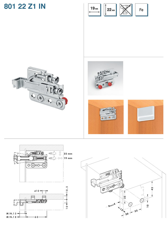 wykonane są całkowicie z najwyższej jakości metalu z zamontowanymi 4 dyblami ø 10 mm oraz dwoma miejscami na dodatkowe wkręty. Posiadają dwie czołowe regulacje: 22 mm w pionie i 19 mm w poziomie. Są proste w montażu. Do ściennej płytki montażowej dosuwamy szafkę z zamontowaną zawieszką, w momencie dociśnięcia, poprzez zatrzask, następuje zawieszenie mebla – działa to jak zawiasy klip. Dzięki takiemu mechanizmowi nie ma możliwości samoistnego odpięcia się szafki, aby to zrobić, należy nacisnąć, na przykład śrubokrętem, na sprężynę listwową w ściennej płytce montażowej, wtedy następuje wysunięcie haka.