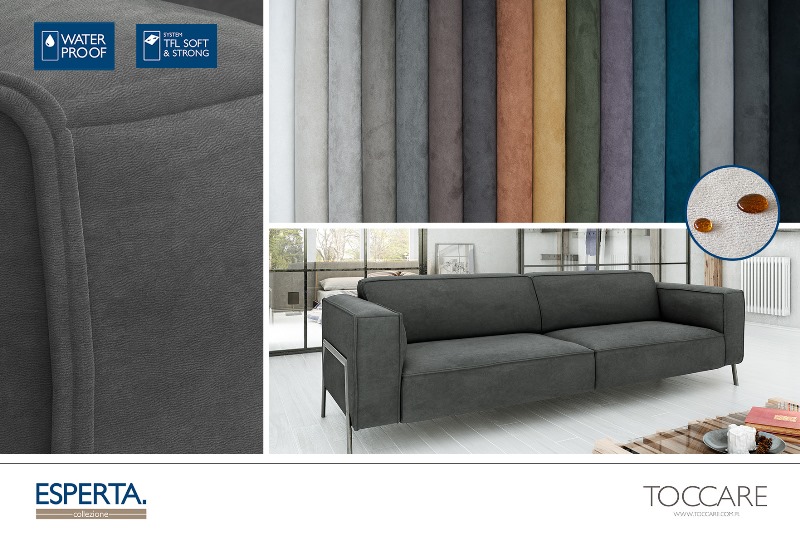 Innowacyjna struktura tkaniny, składająca się aż z trzech warstw: podkładu, wypełnienia piankowego (warstwa TFL Soft & Strong) i części licowej, czyli włókien nubuku syntetycznego. Dzięki TFL Soft & Strong System ESPERTA nie jest tak sztywna, jak standardowy nubuk, lepiej formuje się na meblu – materiał nie marszczy się i nie fałduje. ESPERTA jest tkaniną wodoodporną, oznacza to, że w przypadku rozlania na nią soku czy kawy wystarczy przyłożyć chłonną ściereczkę, która zbierze ciecz.