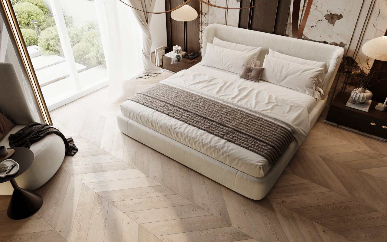 Adam Dolny za projekt „Harmonia zaklęta w jodełce” z podłogą FertigDeska Chevron Dąb Color Caldo. Ta sypialnia to esencja spokoju, ponadczasowej elegancji i subtelnej zmysłowości. Projekt opiera się na harmonijnym połączeniu naturalnych materiałów, miękkich form i wysublimowanych detali. Drewniane podłogi, ułożone w jodełkę francuską, wprowadzają do wnętrza rytm, szlachetność i architektoniczną głębię.