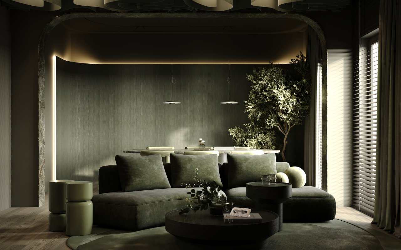 Karolina Michałkiewicz-Kasina za projekt „Monochromatyczna opowieść – zieleń w towarzystwie drewna” z podłogą FertigDeska Dąb Color Nero. Koncepcja wnętrza salonu została oparta na monochromatycznych odcieniach zieleni – barwy symbolizującej równowagę, harmonię oraz bliskość natury. Wyeksponowana drewniana deska podłogowa na ścianie oraz podłodze „opowiada” historię miejsca i nadaje wnętrzu autentyczności.